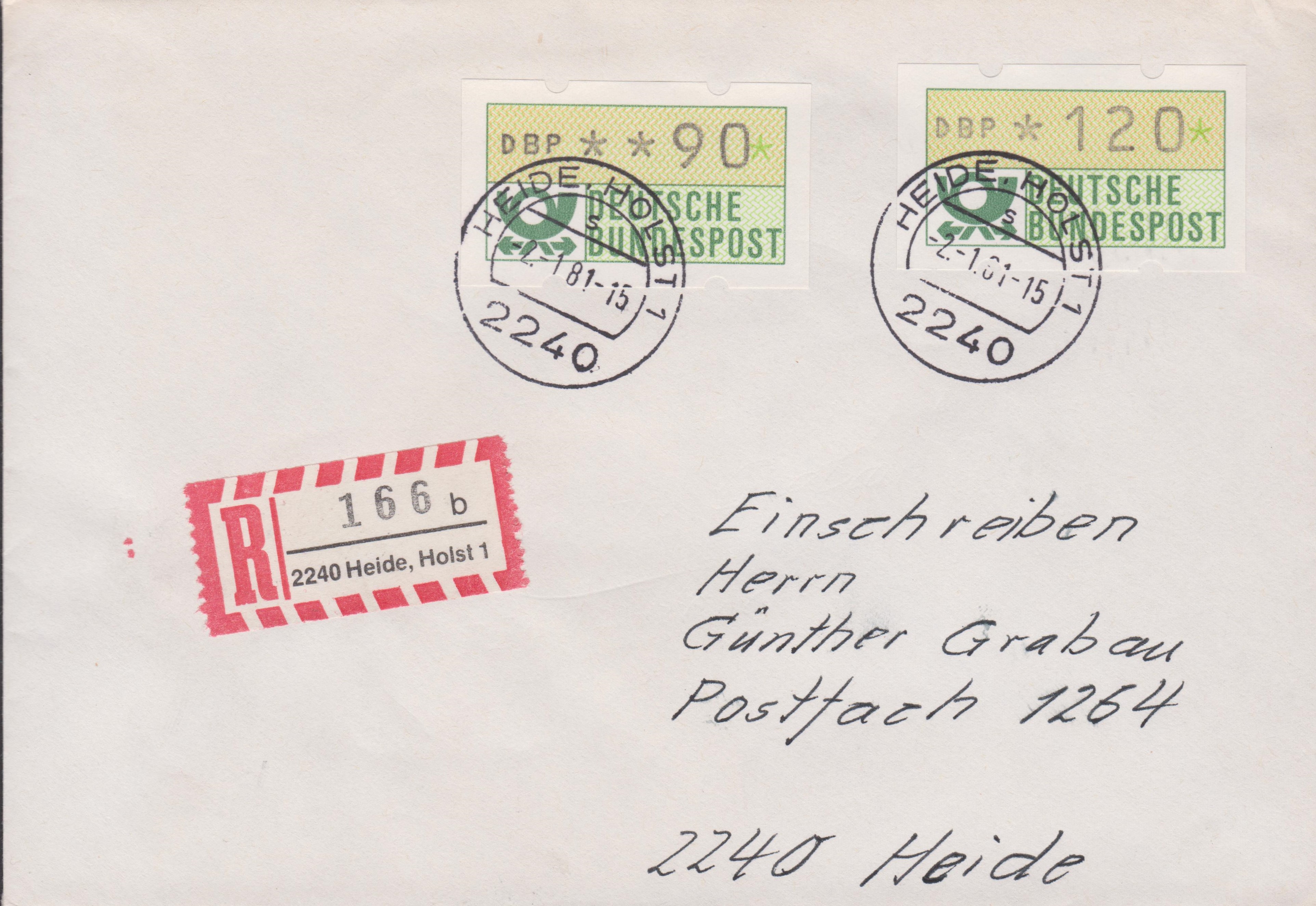 ATM MiNr. 1: Mischfrankatur der Wertstufen 90 Pf und 120 Pf am "-2.-1.81" (= Erstausgabetag) ab "2240 HEIDE" portogerecht auf Brief (60 Pf) per Einschreiben (150 Pf):