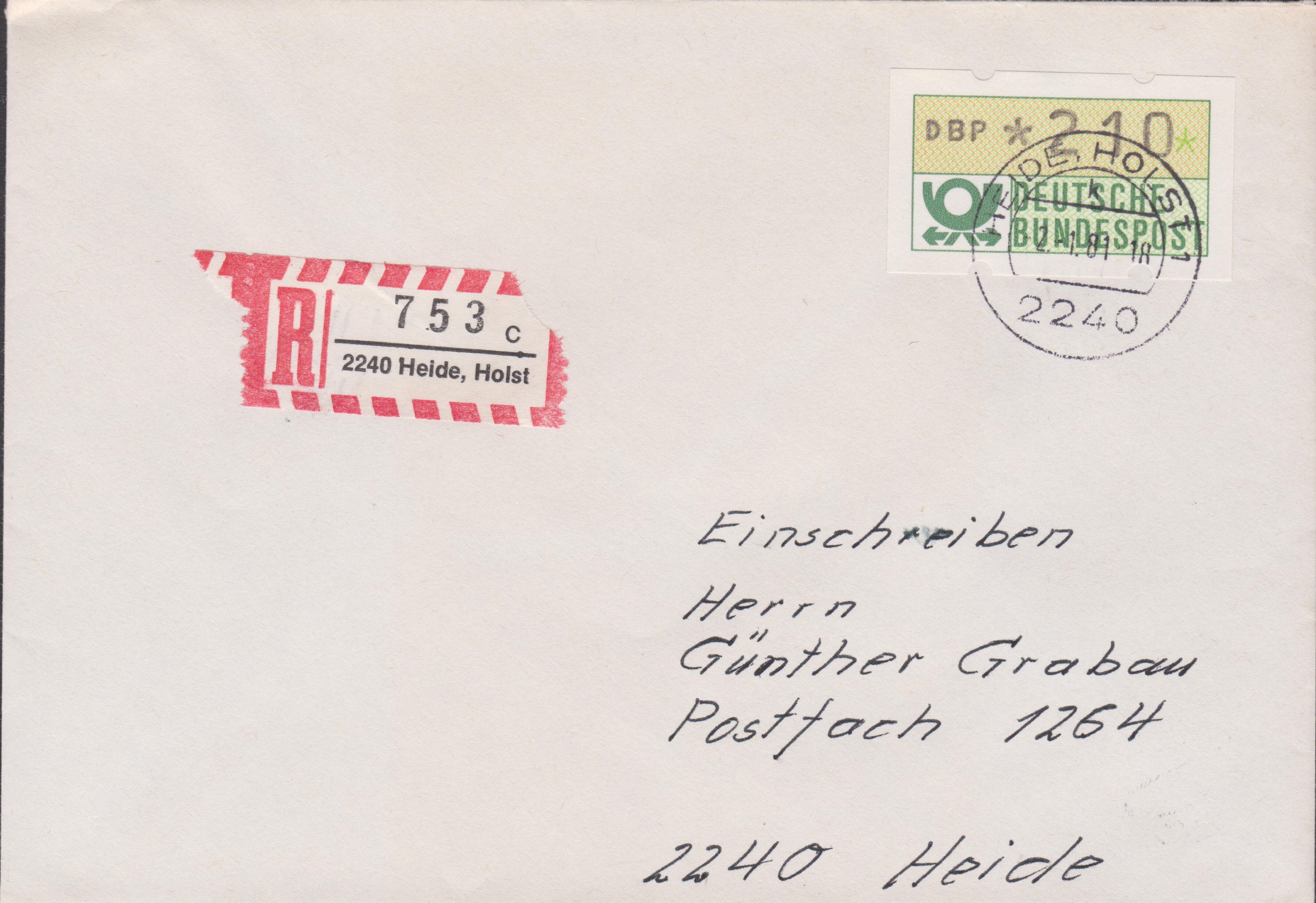 ATM MiNr. 1: Einzelfrankatur der Wertstufen 210 Pf am "-2.-1.81" (= Erstausgabetag) ab "2240 HEIDE" portogerecht auf Brief (60 Pf) per Einschreiben (150 Pf):
