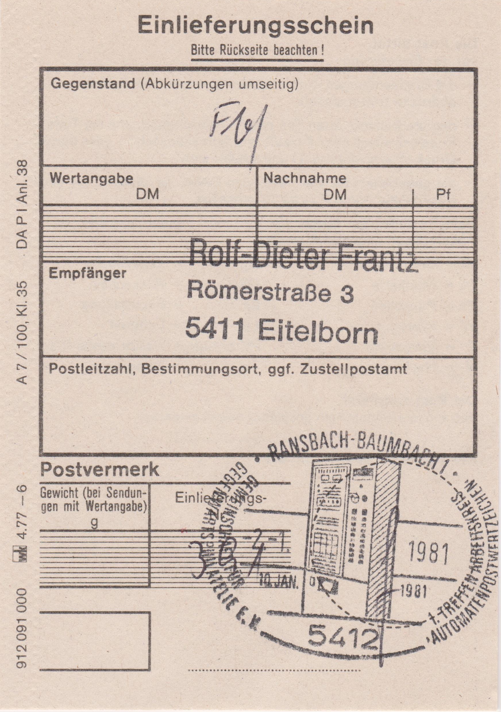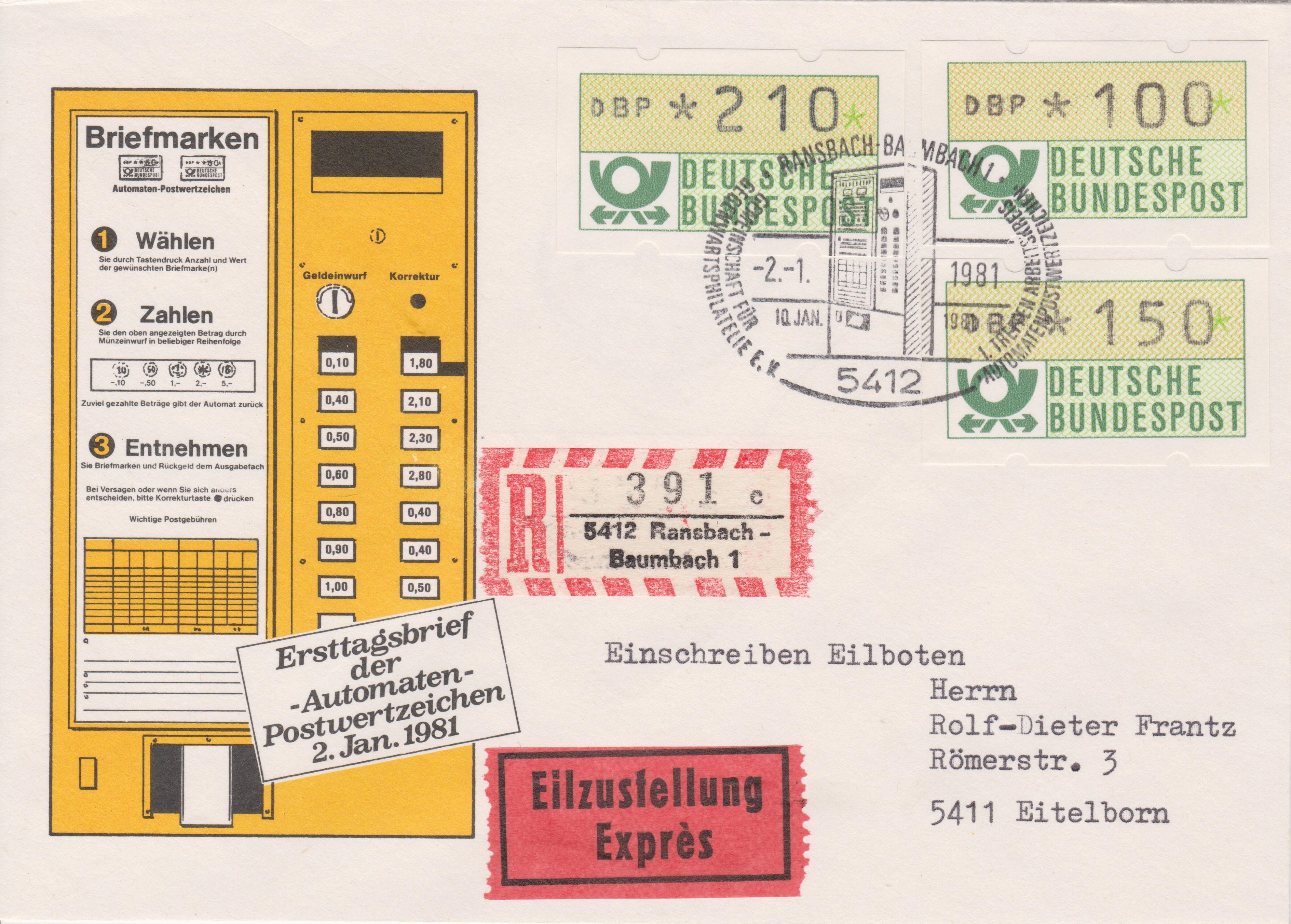 ATM MiNr. 1: Mischfrankatur der Wertstufen 100 Pf, 150 Pf und 210 Pf am "-2.-1.1981" (= Erstausgabetag) ab "5412 RAMSBACH-BAUMBACH 1" portogerecht auf Brief (60 Pf) per Einschreiben (150 Pf) und Eilzustellung (250 Pf), adressiert nach 5411 Eitelborn: