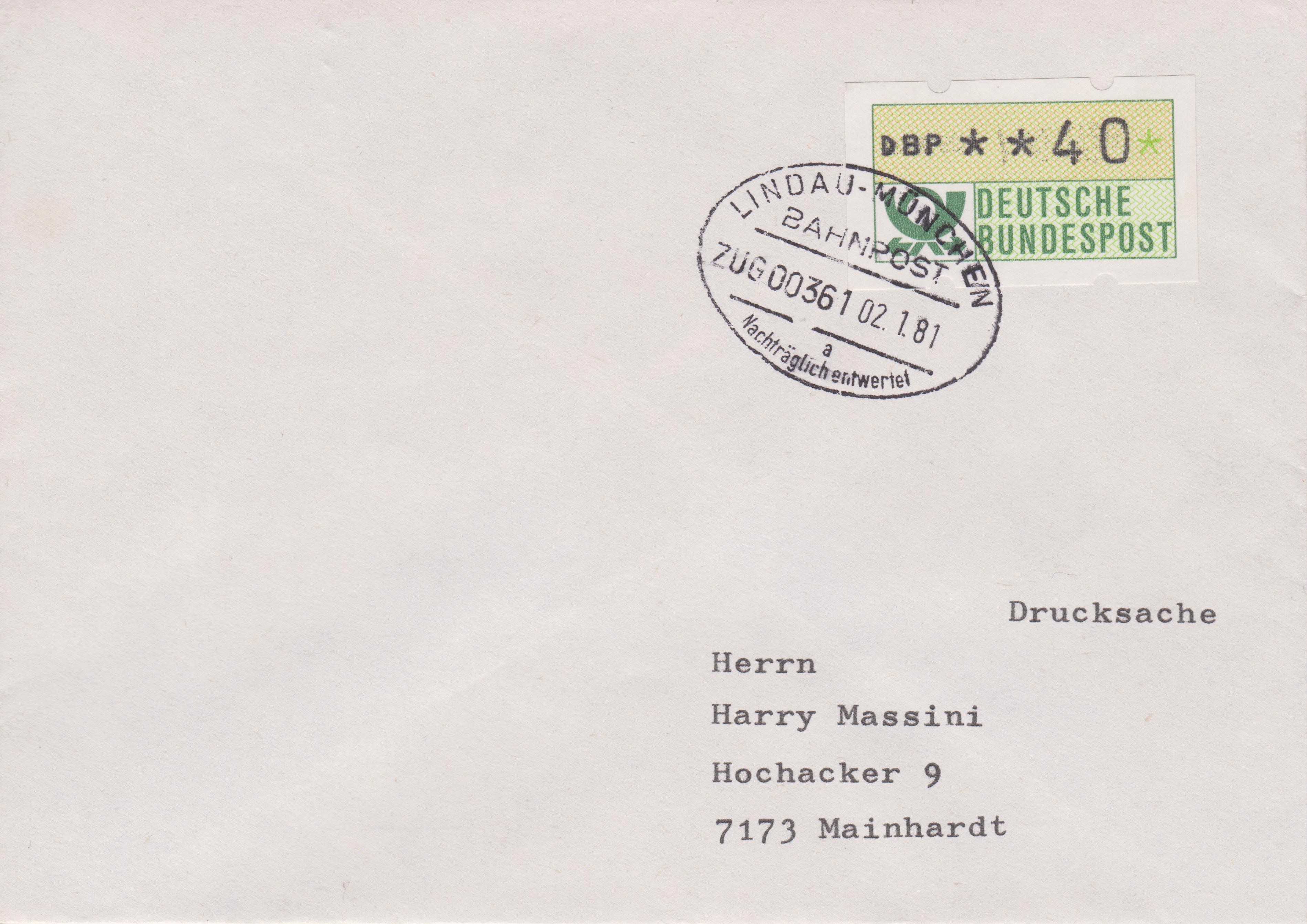 ATM MiNr. 1: Einzelfrankatur der Wertstufe 40 Pf portogerecht auf Drucksache bis 20 g, am "02. 1.81" (= Erstausgabetag) entwertet per Stempel "LINDAU-MÜNCHEN BAHNPOST ZUG 00361 Nachträglich entwertet":
