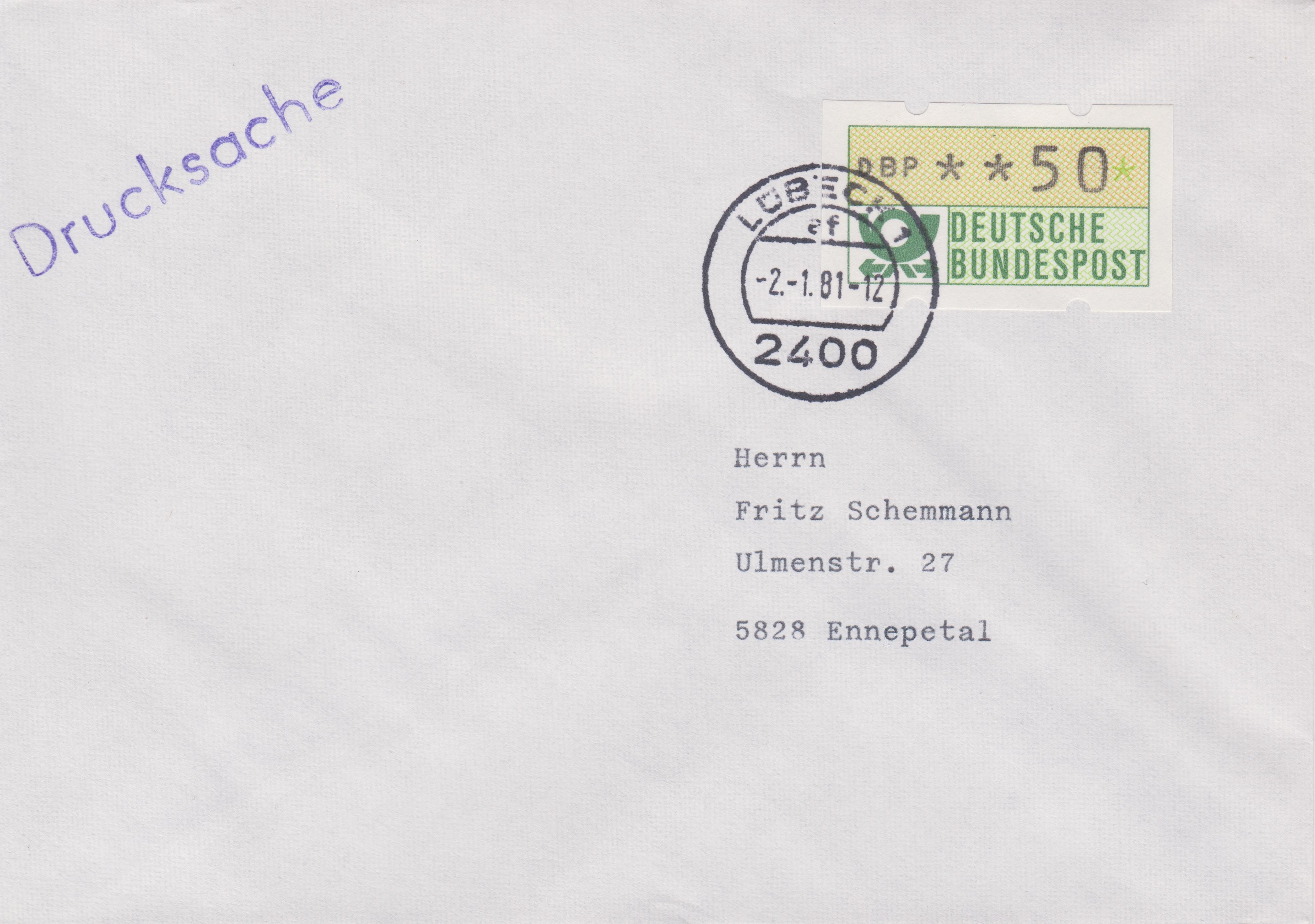 ATM MiNr. 1: Einzelfrankatur der Wertstufe 50 Pf auf "Drucksache", am "-2.-1.81" (= Erstausgabetag) entwertet per Stempel "2400 LÜBECK":