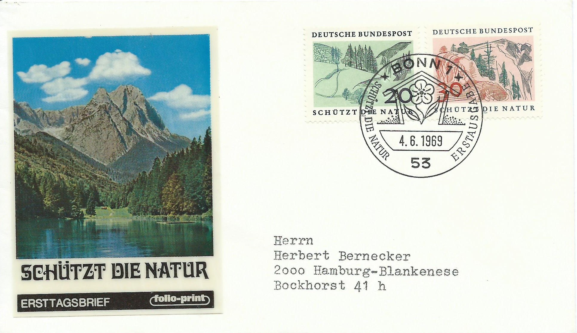 Der Satz „Europäisches Naturschutzjahr 1970“ (Mi.-Nr. 591 – 594) klebt auf den hier gezeigten beiden Ersttagsbriefen. Gestempelt wurde mit dem Ersttagssonderstempel Bonn am 4.6.69.