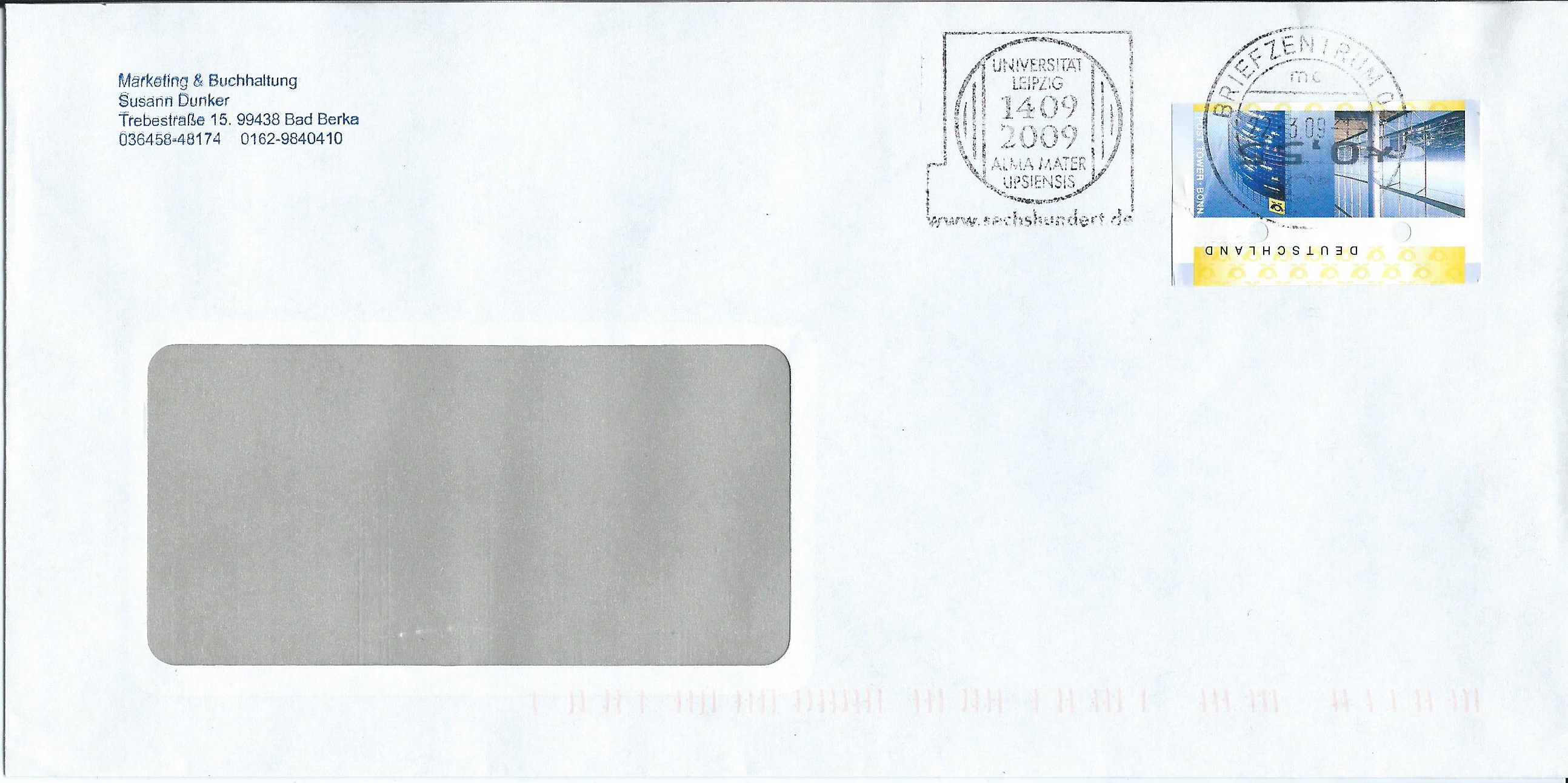 Hier ein völlig kurioses Teil: Frankatur 55 ct rückseitig, was eigentlich nicht zulässig ist. Sie wurde aber trotzdem mit der Maschine entwertet und der Brief gemäss vorderseitiger Anschrift zugestellt. Maschinenstempel Briefzentrum 23 vom 24.7.09.