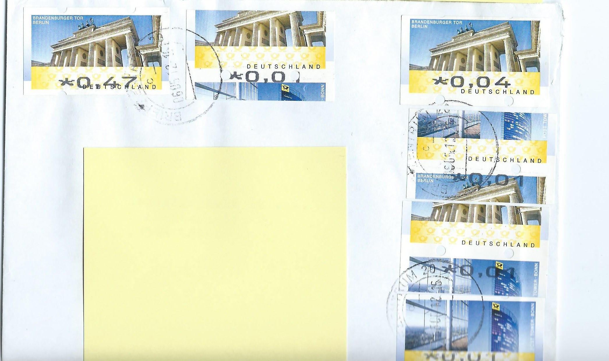 Gefolgt von "Kraut und Rüben": Je eine normale Marke zu 47, 4 und 1 ct, dazu 3 Verschnitte zu je 1 ct auf einem Beleg. Der ging an eine Behörde und ist somit purer Bedarf. So etwas sieht man auch nicht alle Tage! Stempel Briefzentrum 20 vom 6.5.12