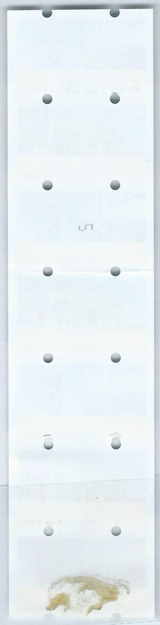 Den Abschluss heute bildet ein ganz besonderes Stück: Ein komplettes Rollenende! Normalerweise gibt der Automat die letzten 6 bis 8 Marken nicht aus. Die letzte Marke ist an einer Papprolle festgeklebt, die die Ausgabe daher unmöglich macht. Die letzte Nummer 5 der Rolle auf der Rückseite kommt im Normalfall nicht in Sammlerhände, maximal bis Nummer 10 wird ausgegeben. Hier kann ich das Ende einer Rolle zeigen, wie es im Automaten verbleibt. Die in diesem Falle 7. Marke wird noch mit dem Werteindruck versehen, aber kann durch das Festkleben des Endes nicht mahr abgeschnitten werden. Der Wert wird dann normalerweise nochmals auf der ersten Marke der 2. im Automaten befindlichen Rolle gedruckt und ausgegeben. An dieses Stück bin ich mit viel Glück und den schon oft beschriebenen offenen Augen herangekommen. Es lag im Gebüsch neben einem im Freien stehenden Automaten herum und hat nur auf mich gewartet :D Vermutlich ist es dem Postbediensteten beim Wechseln der Rolle(n) aus der Hand gefallen oder weggeweht. Nun hat es einen Ehrenplatz in meine Sammlung. Der Knick nach der 4. Marke ist für mich unwichtig, wer kann schon so ein Stück sein Eigen nennen?