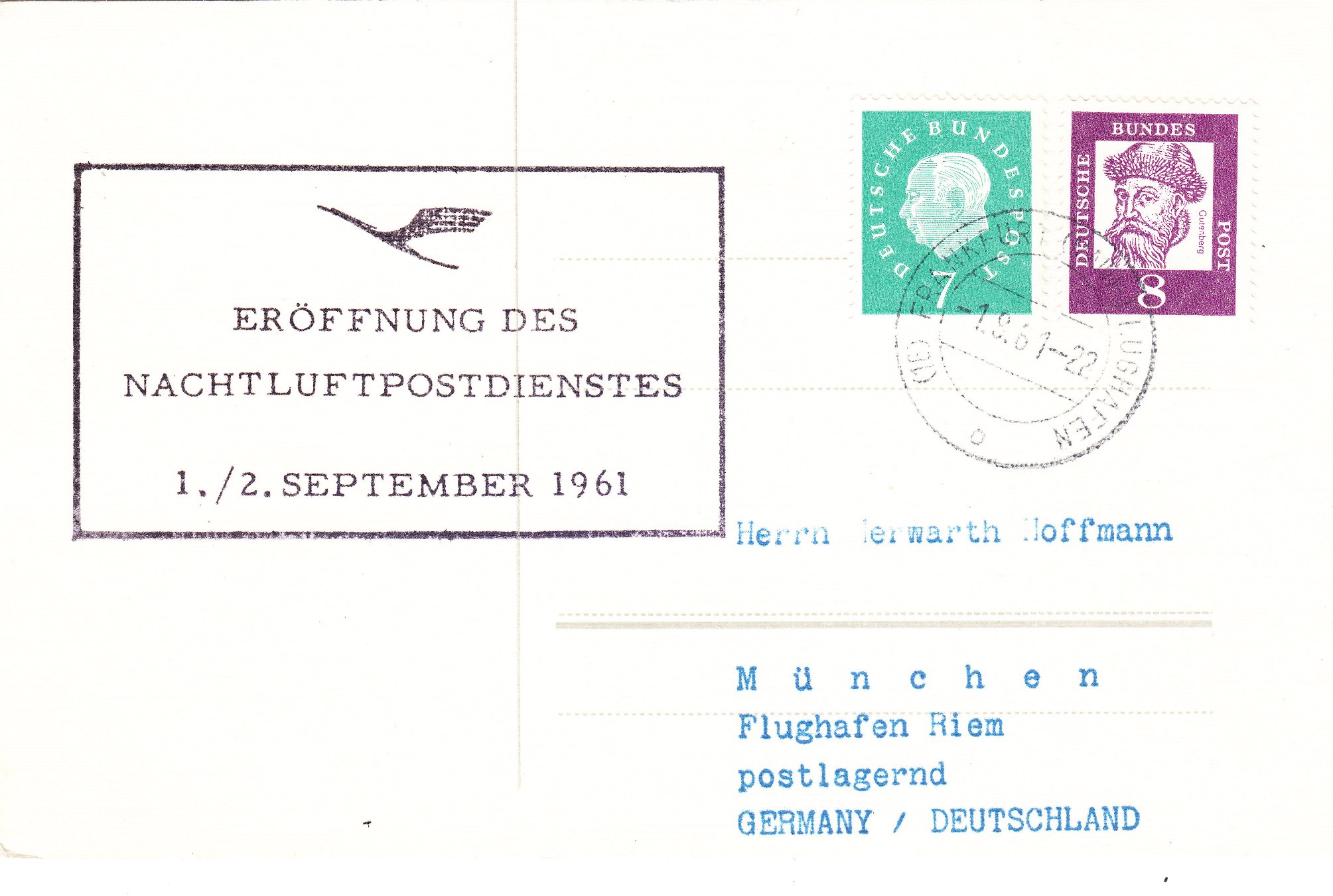 Diese Postkarte im Fernverkehr (10 Pfennig) wurde am Flughafen Frankfurt/Main am 01.09.1961 um 22 Uhr aufgegeben und lief per Inlandsluftpost (5 Pfennig) am Ersttag des Nachtluftpostdienstes von Frankfurt nach München: