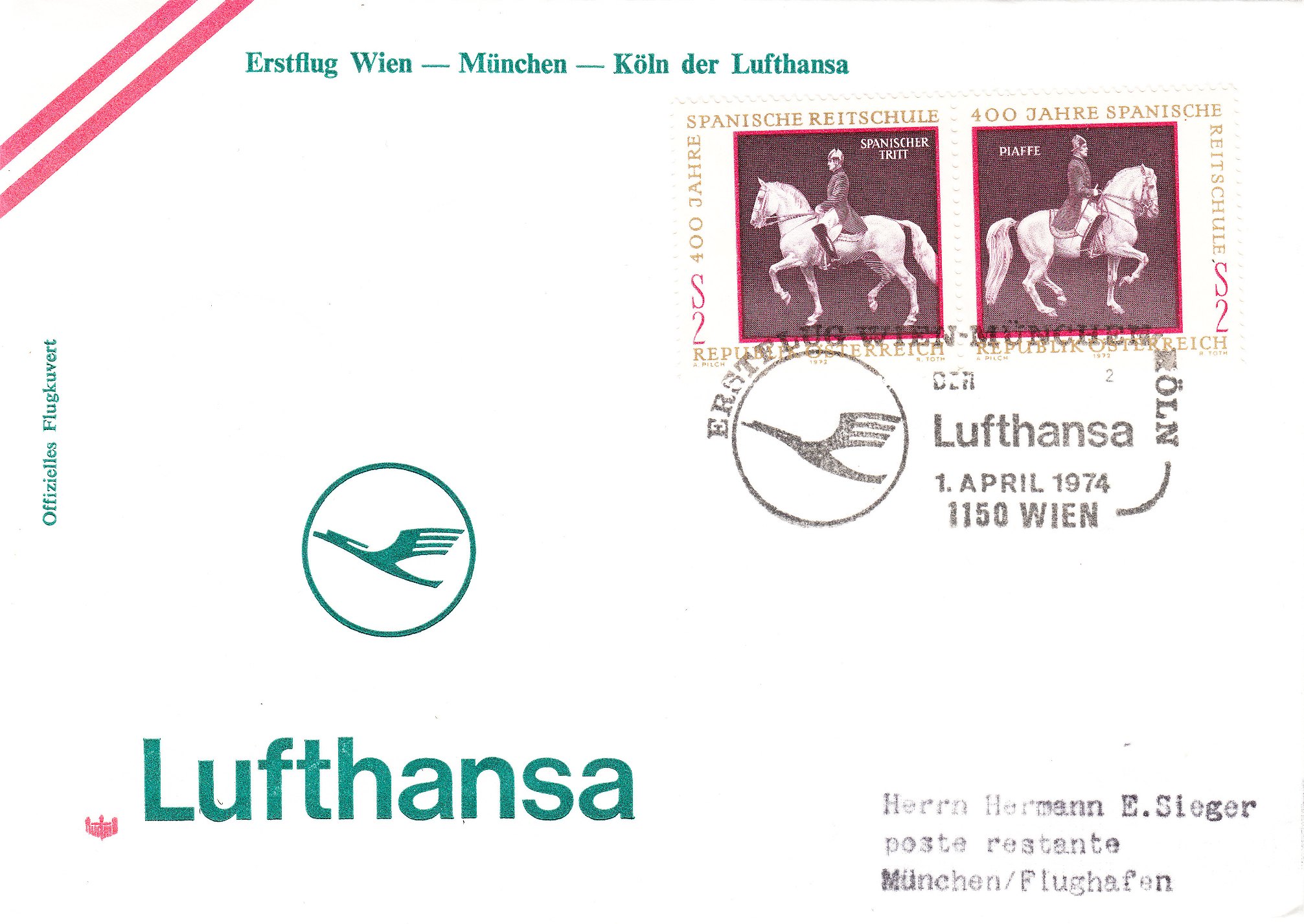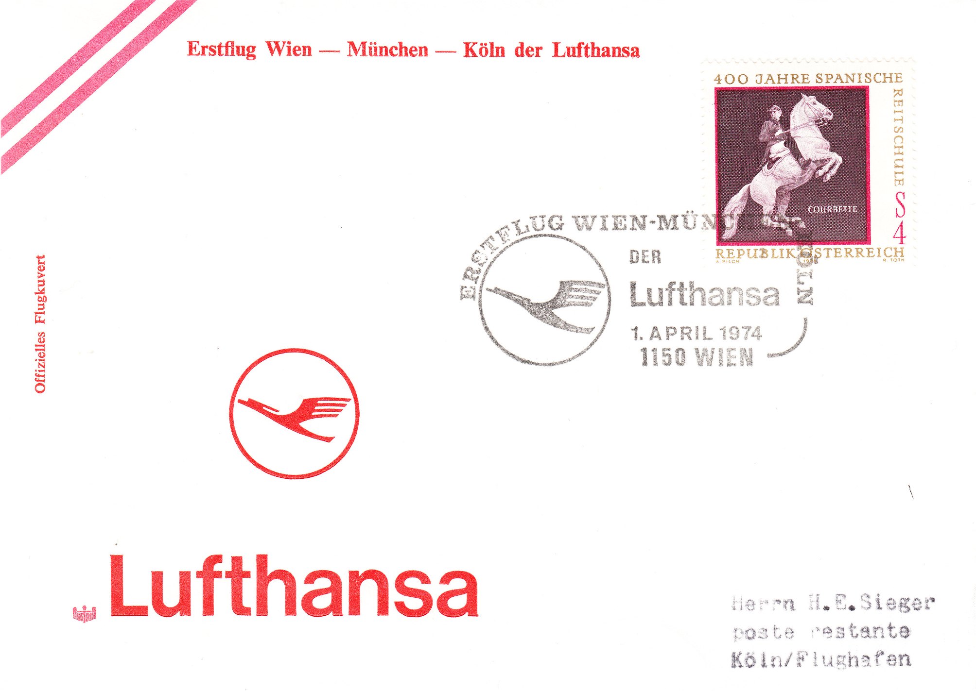 Der Beleg kam am 01.04.1974 um 19 Uhr in Köln an, nachdem der Erstflug von Wien über München nach Köln zunächst am 01.04.1974 um 17 Uhr einen Zwischenstopp in München gemacht hatte, was dieser Beleg dokumentiert: