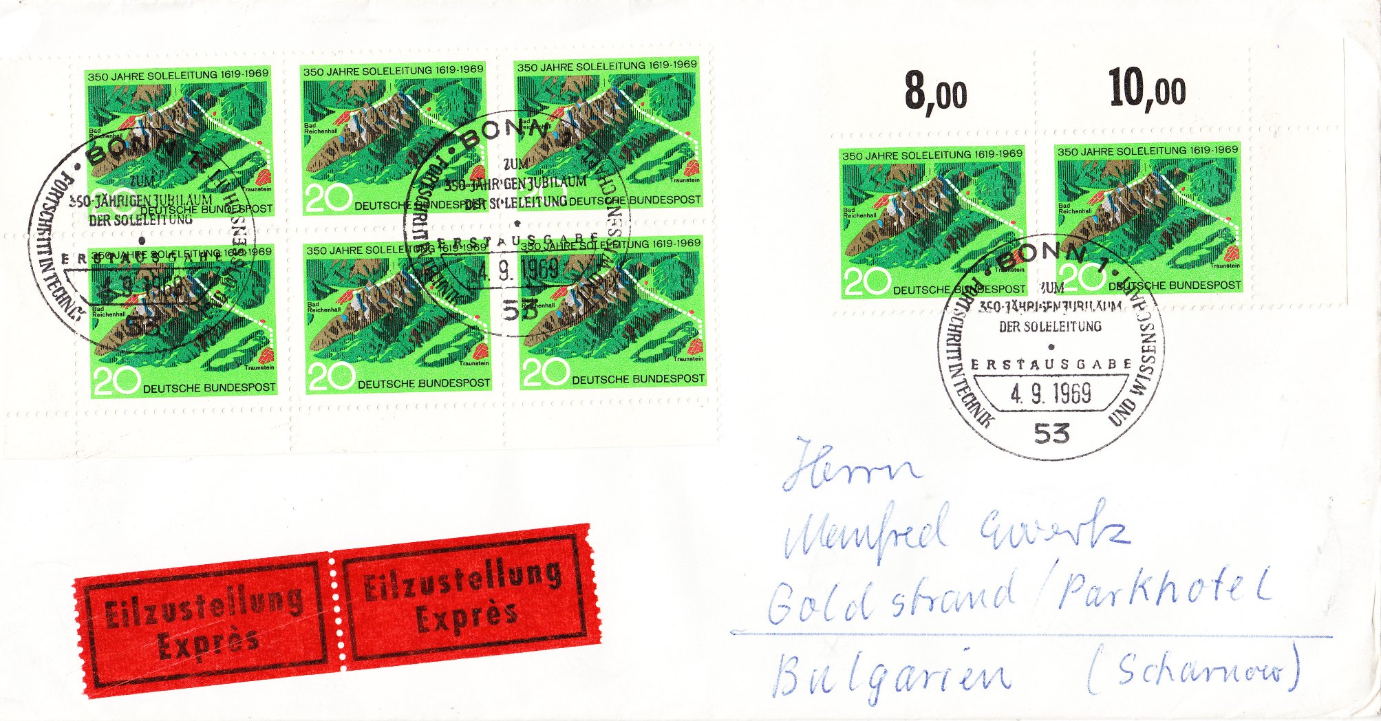 Dieser nach Bulgarien adressierte Brief wurde innerhalb der 30tägigen Frist aufgegeben, während der man den ESST einer neuen Postwertzeichenausgabe auf Beleg abgeschlagen bekommt.