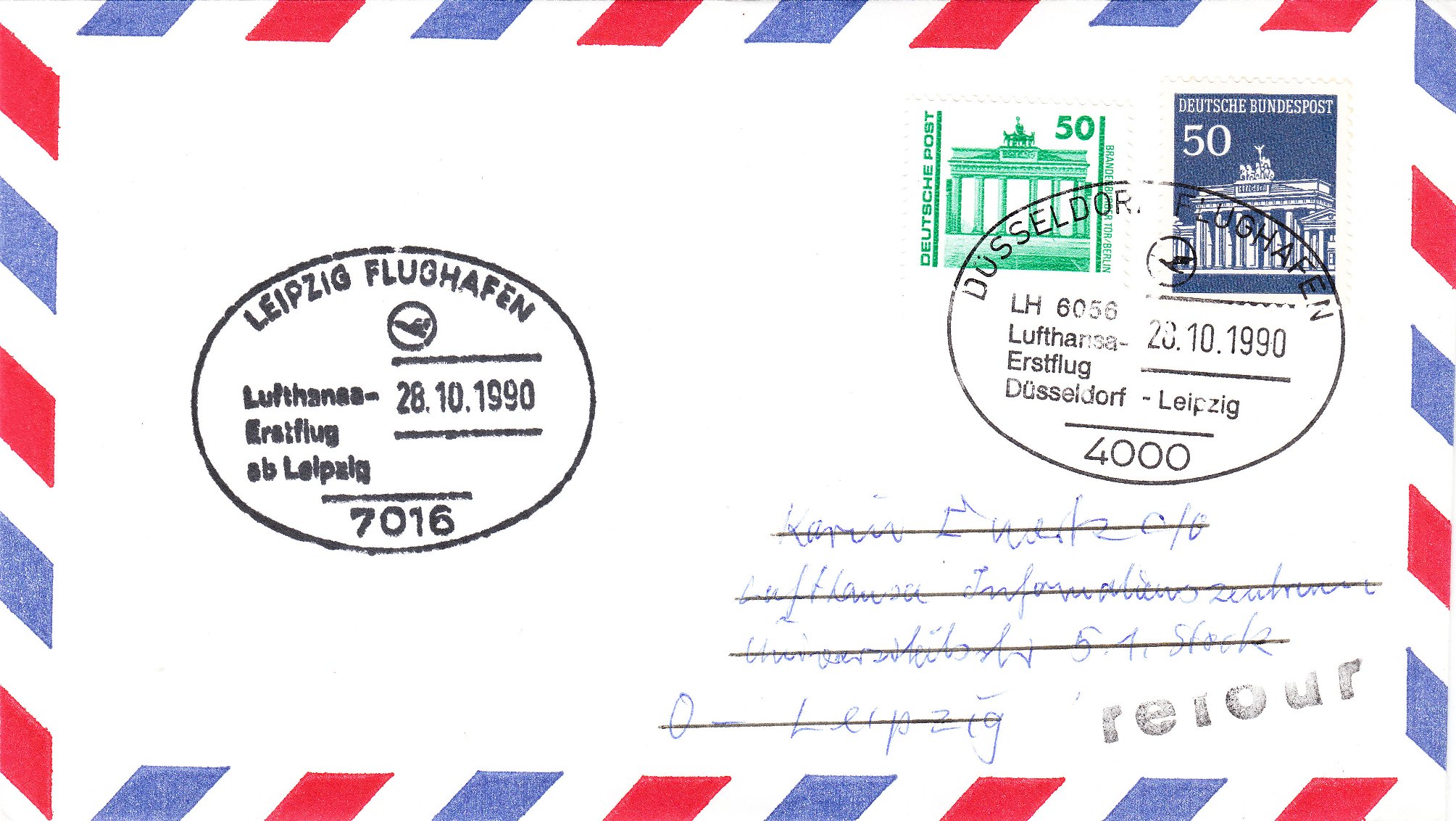 Dieser Beleg dokumentiert den Erstflug der Lufthansa LH 6056 am 28.10.1990 von Düsseldorf nach Leipzig:
