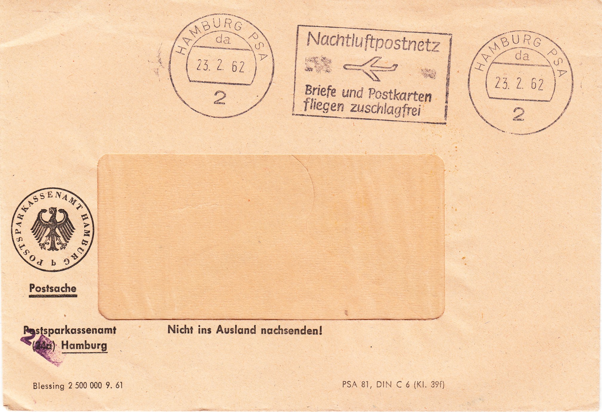 Das seit dem 01.09.1961 verfügbare deutsche Nachtluftpostnetz wurde auch bei diesem Maschinenstempel vom Postscheckamt Hamburg am 23.02.1962 beworben: