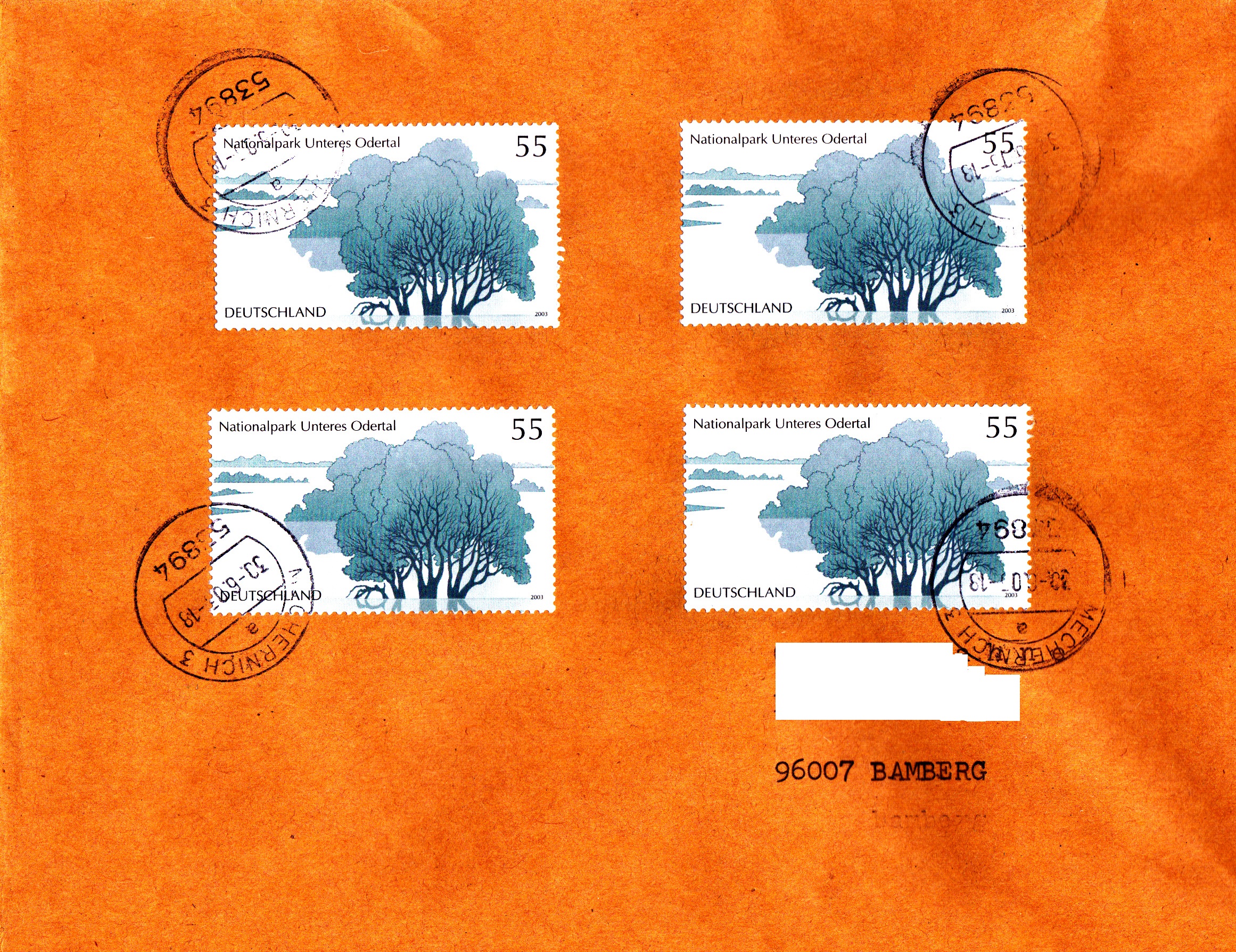 Zur portogerechten Frankatur eines Briefes von 501 bis 1000 g (Portostufe 220 Cent) wurden hier vier Werte (MiNr 2343) aus dem Block Nationalpark Unteres Odertal (MiNr Block 62) verwendet.