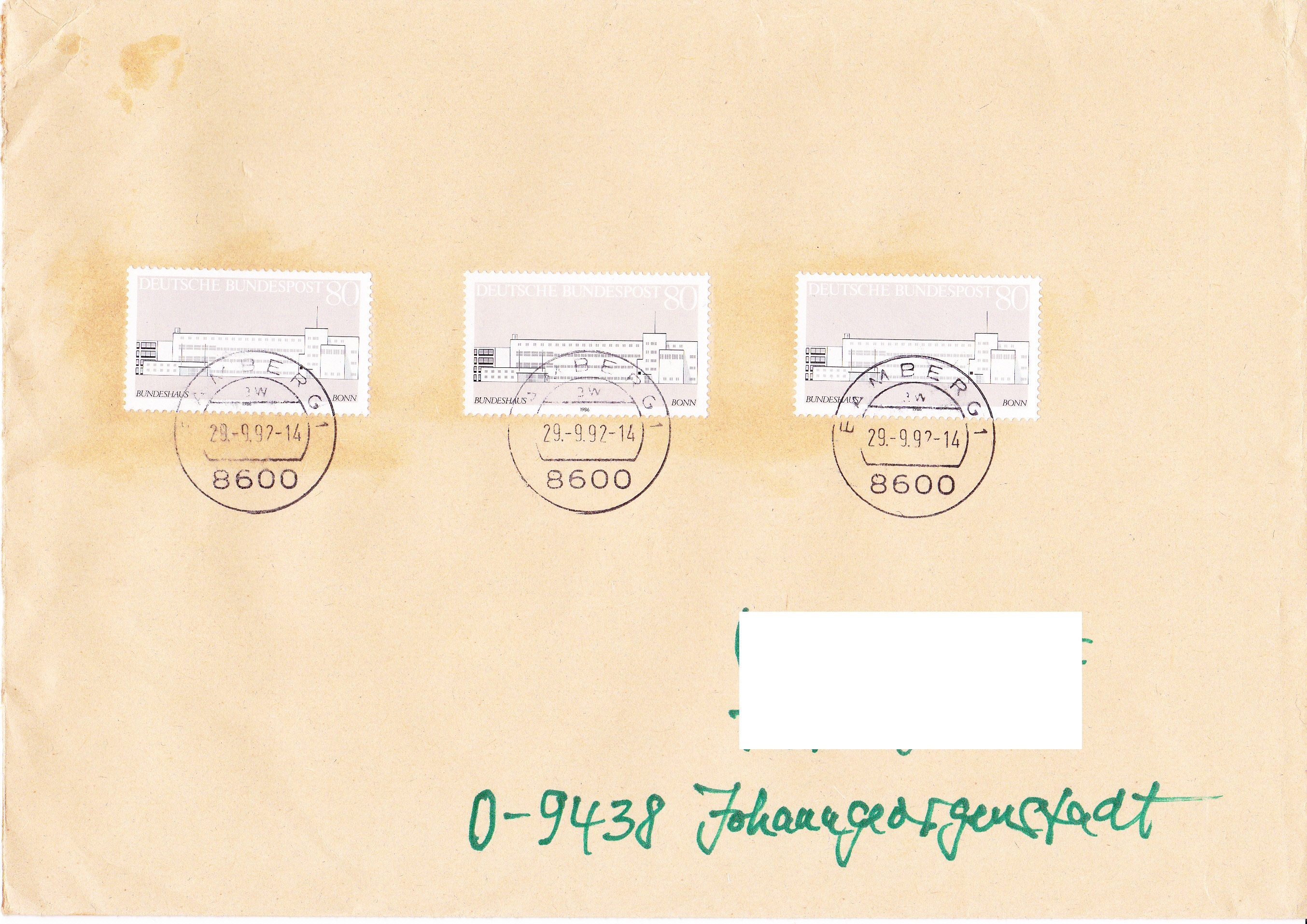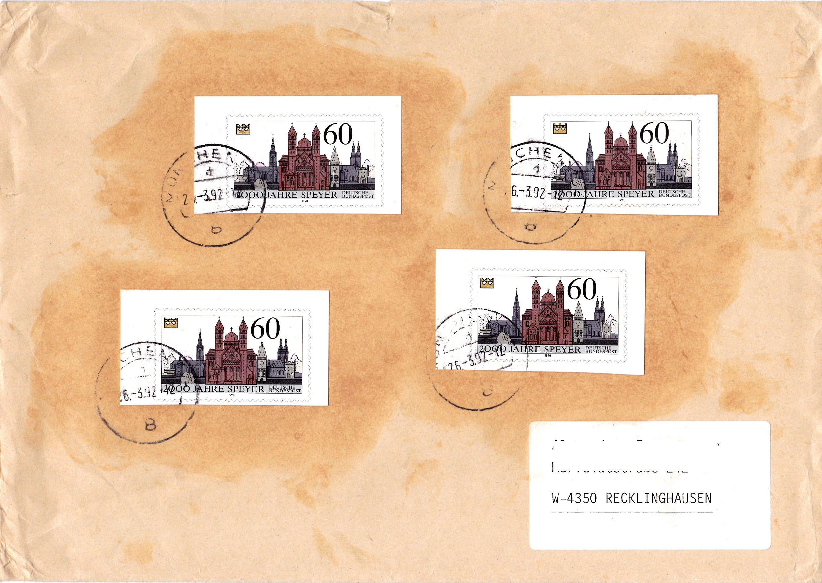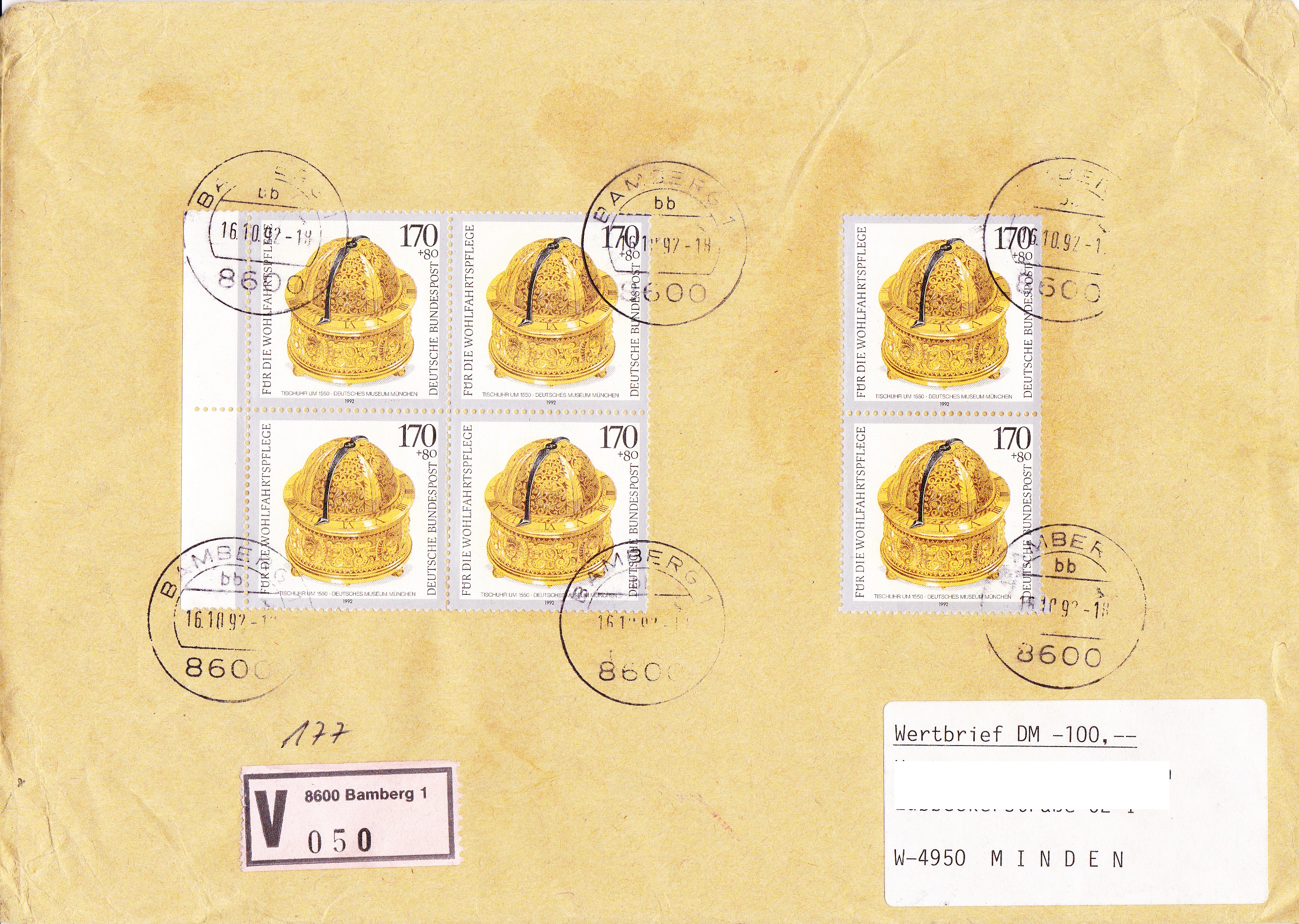 Zur portogerechten Frankatur dieses Wertbriefes wurden am 16.10.1992 sechs Marken des 170+80 Pf-Wertes der Wohlfahrtsmarken 1992 (MiNr 1635, Ersttag am 15.10.1992) benutzt. Das Porto betrug: Brief 51 bis 250 g 320 Pf, Wertangabe bis 500 DM 700 Pf, zusammen 1020 Pf.