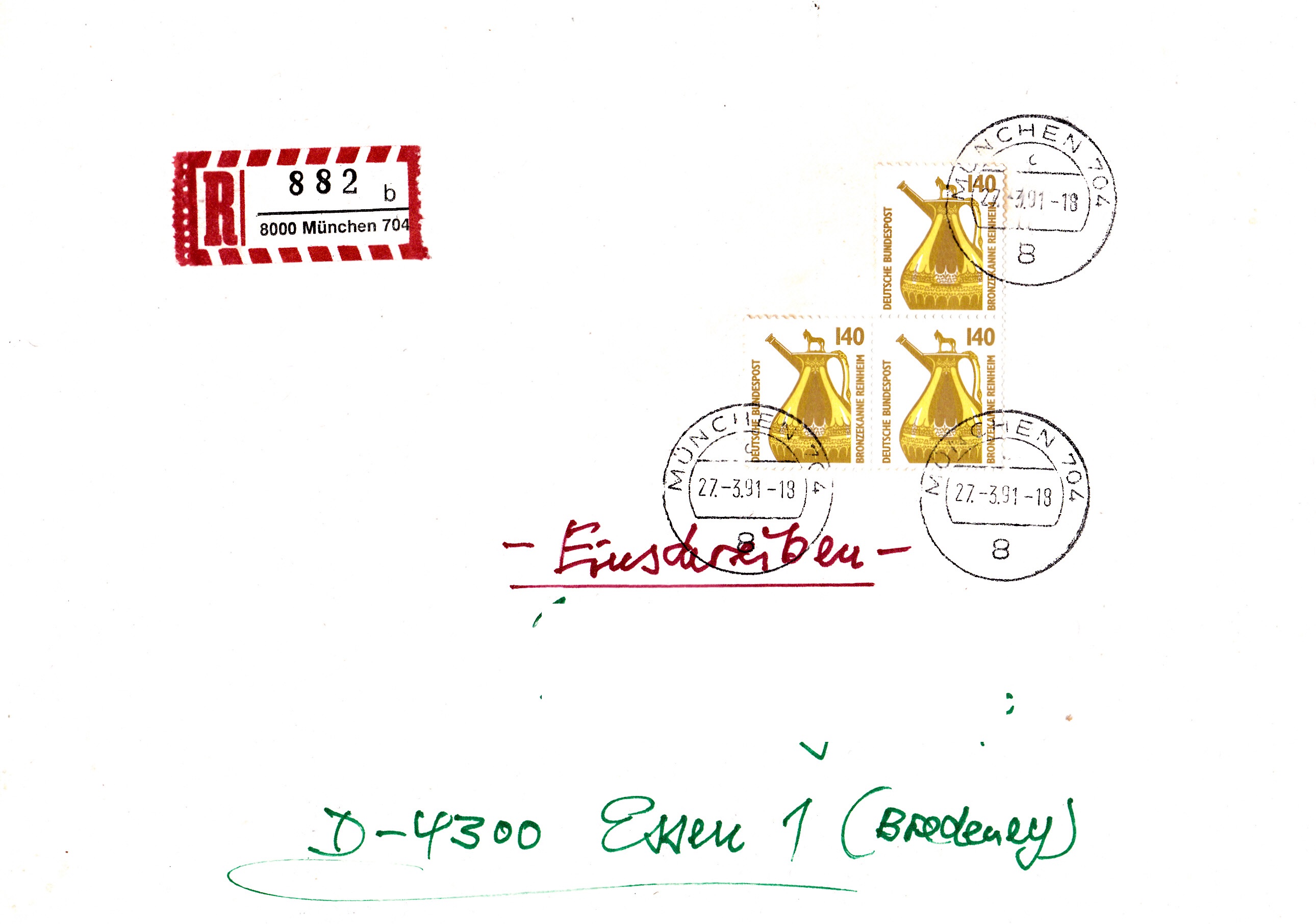 Hier wurde ein waagrechtes Paar mit oben anhängender dritter Marke des 140 Pf-Wertes der Dauerserie Sehenswürdigkeiten (also Bogenwerte) am 27.3.1991 zur Frankatur eines Einschreibebriefes nach Essen benutzt. Das Porto betrug: Brief von251 bis 500 g 170 Pf Einschreiben 250 Pf, zusammen 420 Pf = 3x 140 Pf.