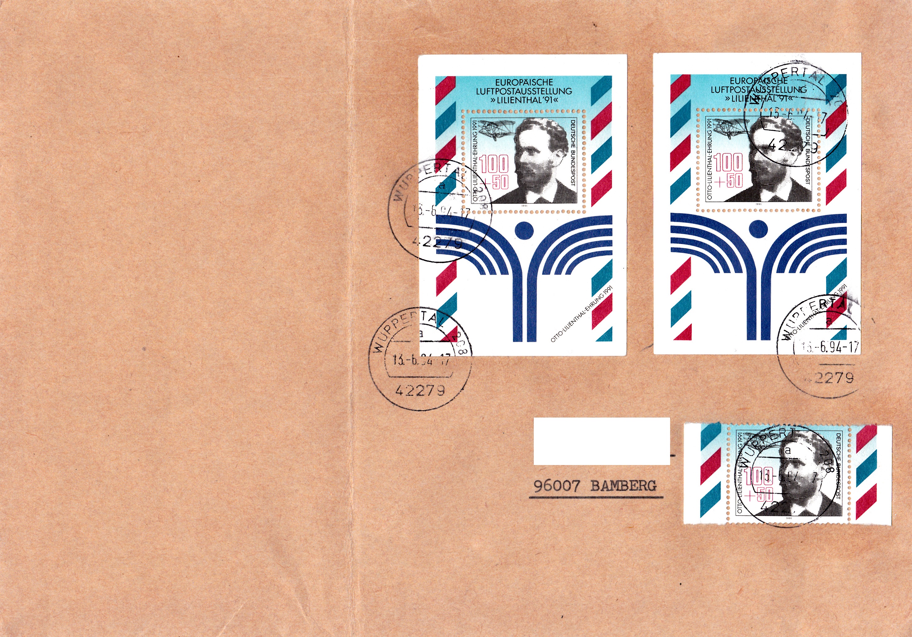 Brief von 51 bis 500 g portogerecht frankiert mit zweimal Block 24 "Europäische Luftpostausstellung LILIENTHAL'91, Dresden" und einem Ausschnitt aus Block 24 mit der Marke MiNr 1543.