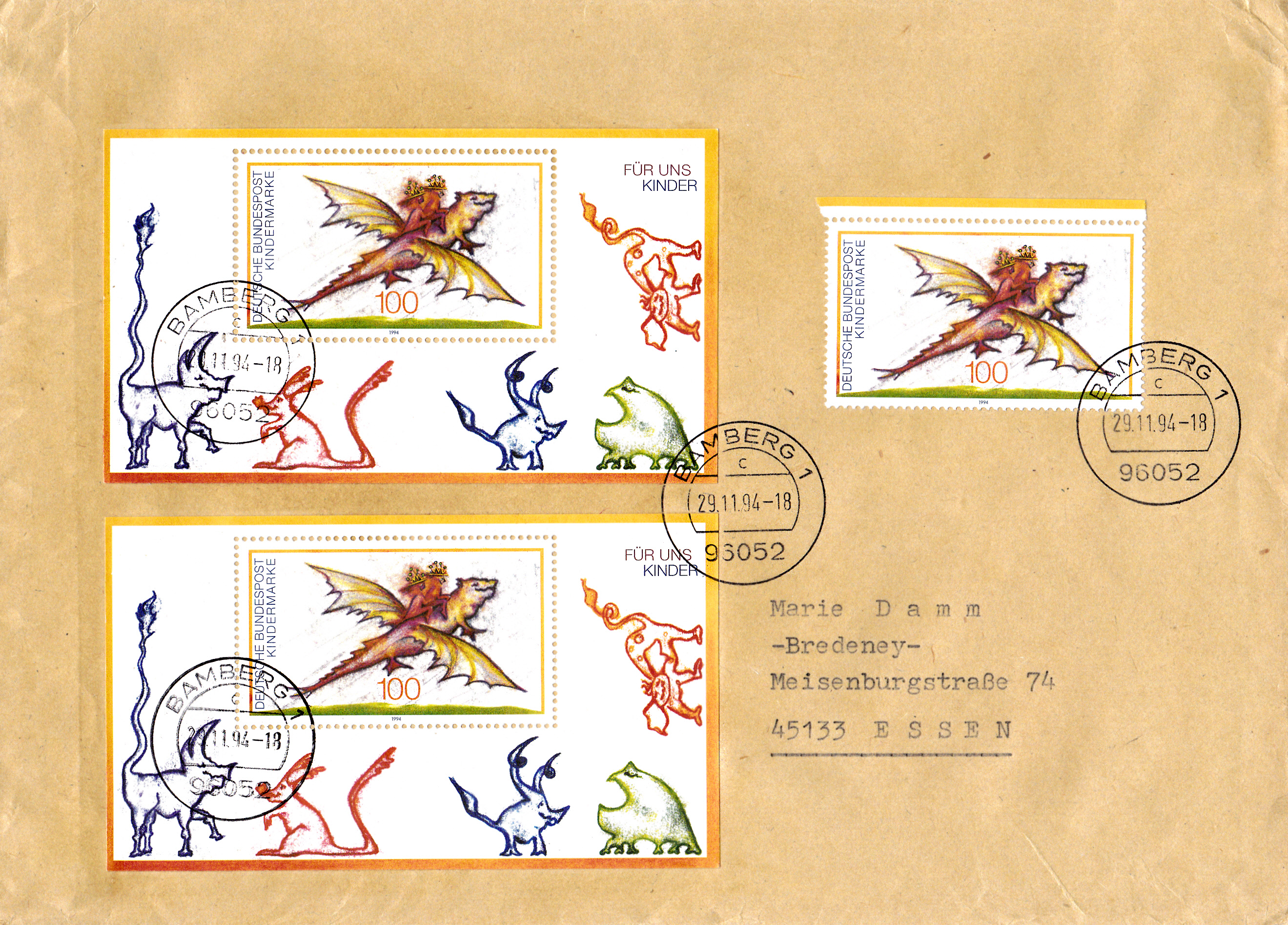 Es folgt hier jetzt ein Brief von 51 bis 500 g vom 29.11.1994 mit zwei kompletten Blocks "Für uns Kinder" vom 8.9.1994 (MiNr Block 30) und einer Marke aus dem Block (MiNr 1754).