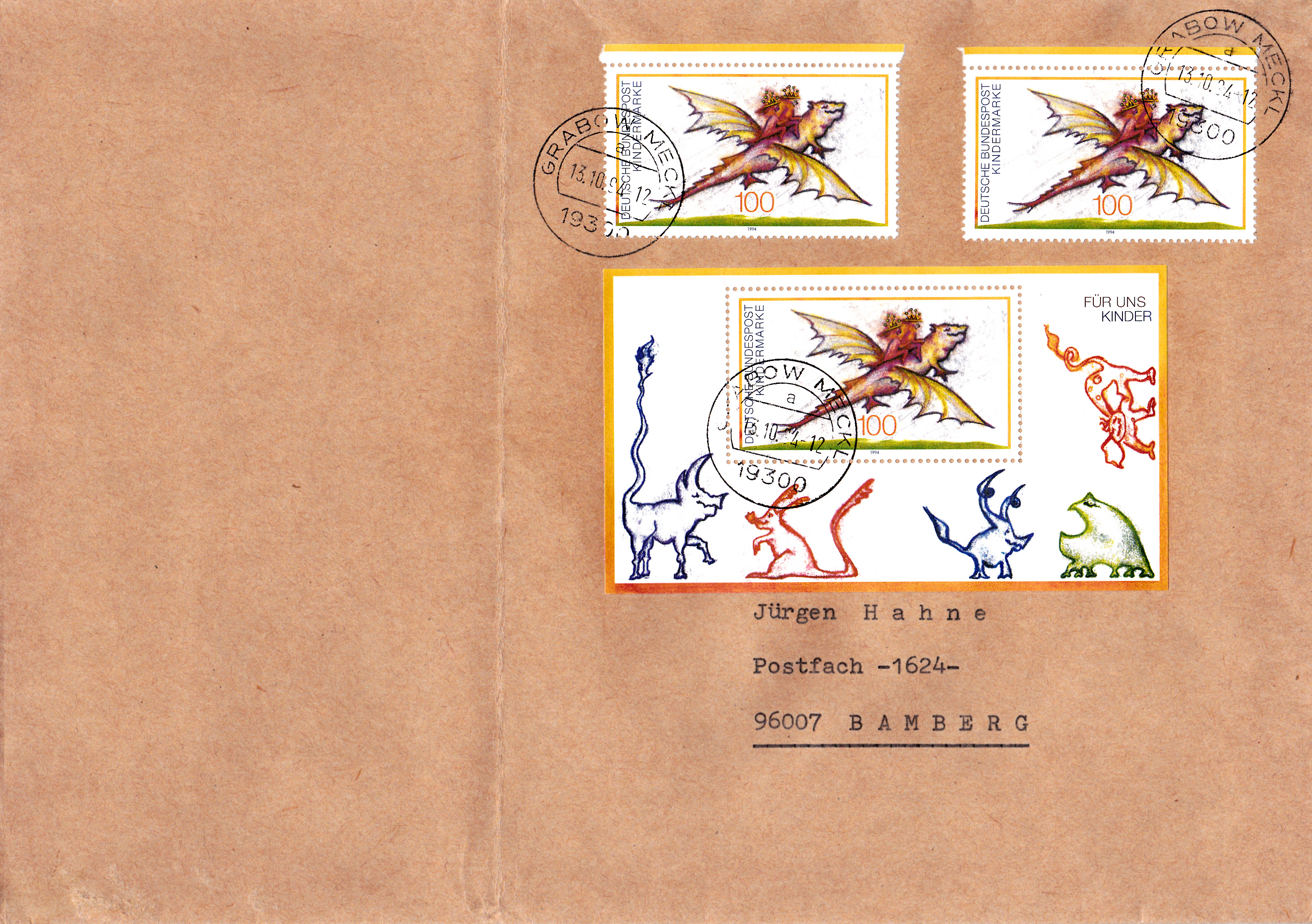 Und hier nun ein Brief von 51 bis 500 g vom 13.10.1994 mit nur einem kompletten Blocks "Für uns Kinder" vom 8.9.1994 (MiNr Block 30) und zwei Marken aus dem Block (MiNr 1754).