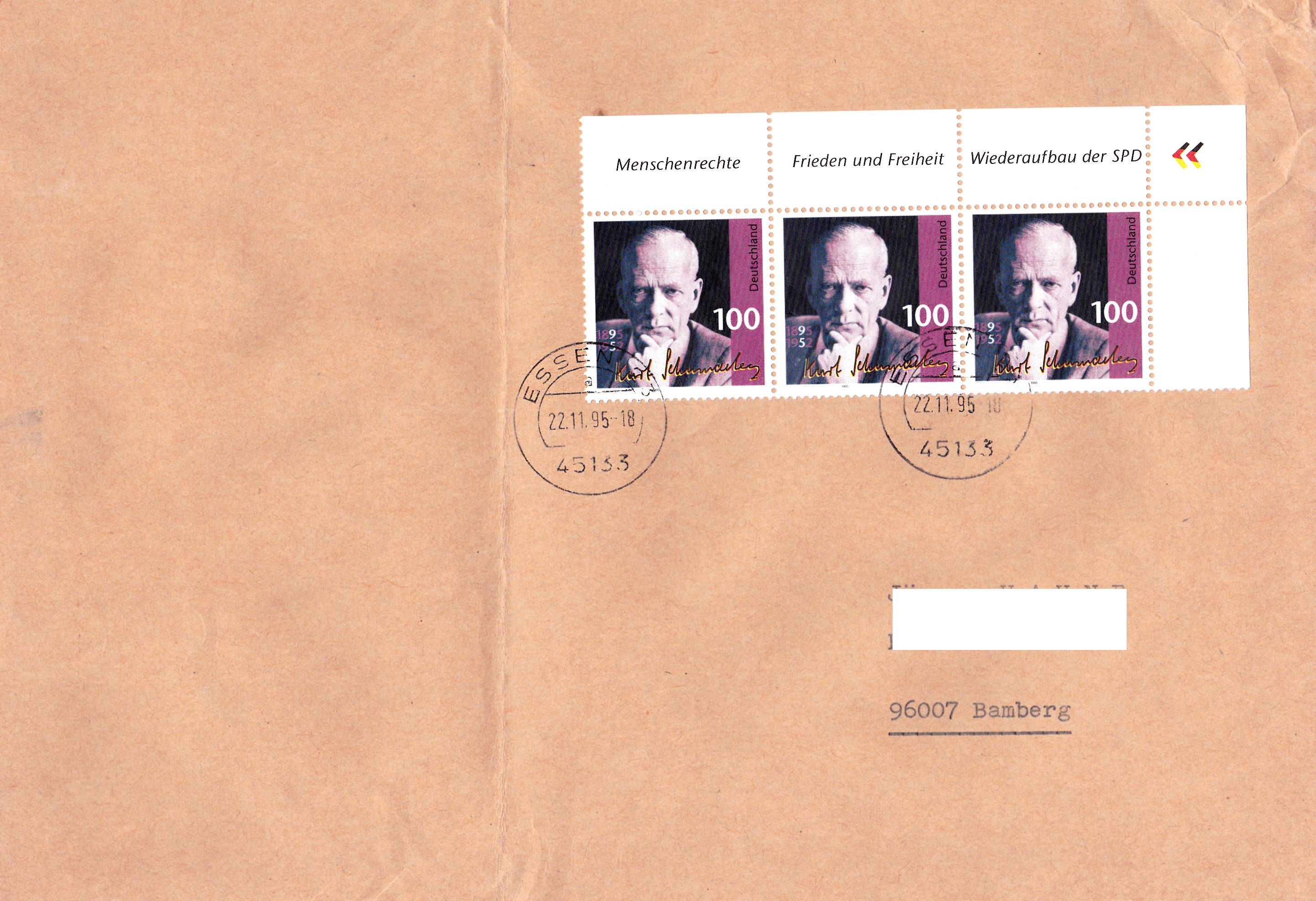 Dreierstreifen vom oberen rechten Bogenrand der Marke zum 100.Geburtstag von Kurt Schumacher (MiNr 1824) als portogerechte Frankatur eines Briefes von 51 bis 500 g vom 22.11.1995 nach Bamberg.