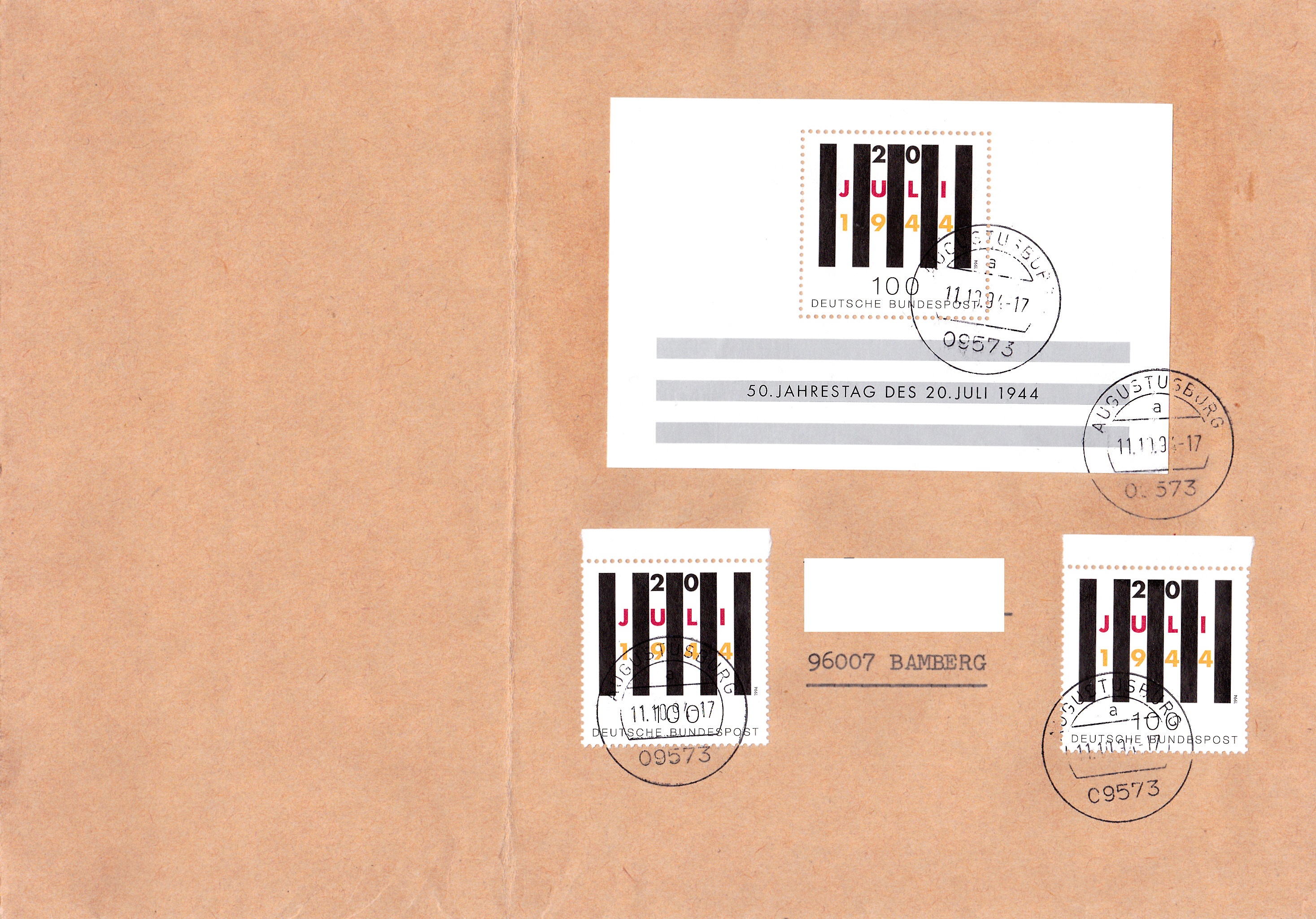 Bei diesem Brief von 51 bis 500 g wurde einmal die Blockausgabe zu 50. Jahrestag des Attentats auf A. Hitler (MiNr Block 29) ein zweimal die Marke aus diesem Block (MiNr 1741) zur portogerechten Frankatur benutzt.