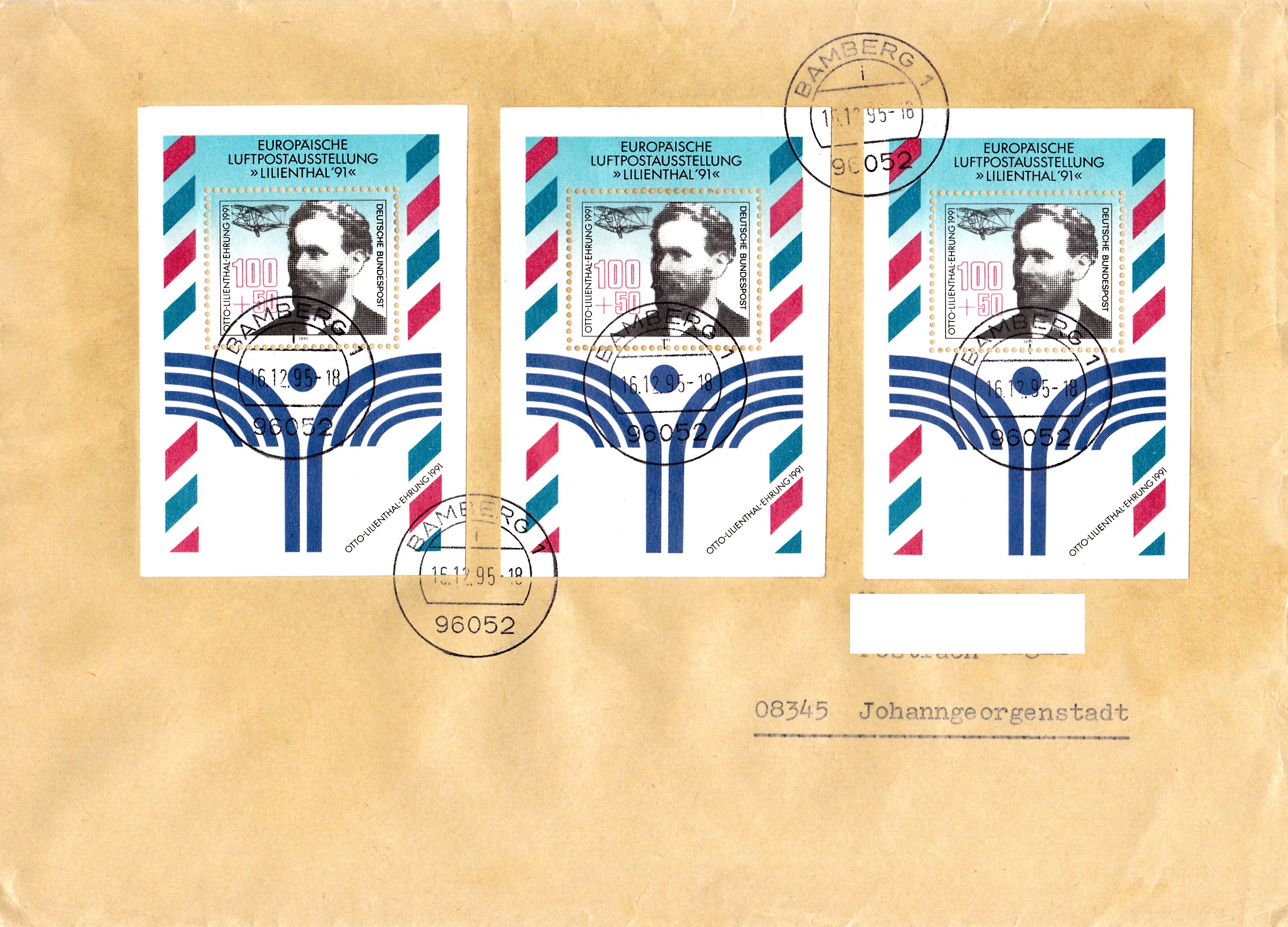 Ergänzend zu einem früheren Beitrag hier ein Brief von 51 bis 500 g portogerecht frankiert mit dreimal Block 24 "Europäische Luftpostausstellung LILIENTHAL'91, Dresden".