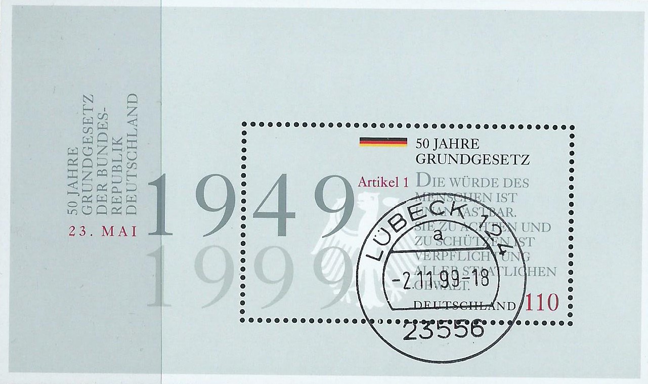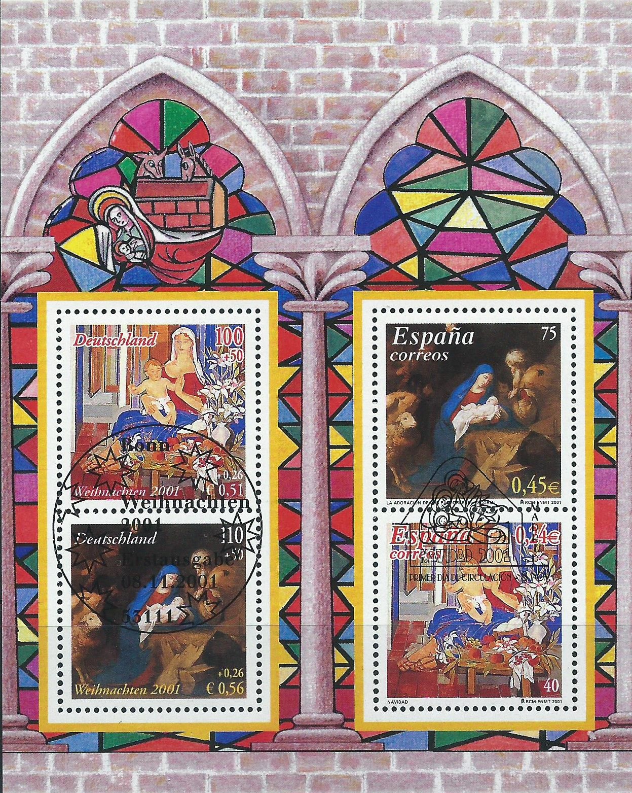 Block 56 erschien am 8.11.2001. Er ist ein ganz besonderer Block, er enthält neben 2 Werten der Deutschen Post auch 2 Werte der Spanischen Post mit identischen Motiven. Links im Block sind die beiden deutschen Werte zu 100 + 50 Pf (0,56 + 0,26€) und 110 + 50 Pf (0,56 + 0,26€) als senkrechter Zusammendruck enthalten, rechts die beiden spanischen Werte. Die Marken waren nur in ihren jeweiligen aufgedruckten Ländern gültig, es mussten also 2 verschiedene Stempel darauf abgeschlagen werden. Viele Sammler versuchten seinerzeit den Block komplett in Deutschland stempeln zu lassen, aber der deutsche Stempel auf spanischen Marken, das geht gar nicht. Streng genommen würde ein Prüfer hier „Stempel falsch“ prüfen. Der hier gezeigte Block hat aber die richtigen Stempel, links den Ersttagssonderstempel Bonn und rechts den von Madrid. Theoretisch wäre es möglich gewesen, auch Tagesstempel aus beiden Ländern auf dem Block abschlagen zu lassen, aber ob das viele Sammler geschafft haben?
