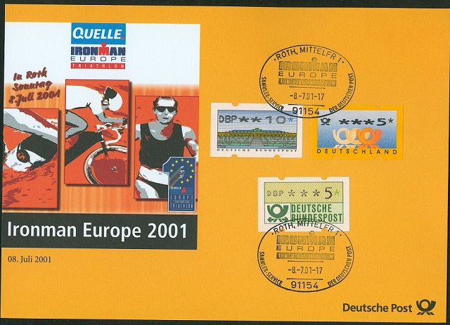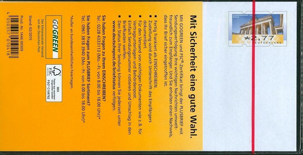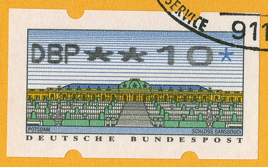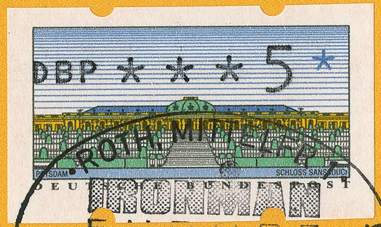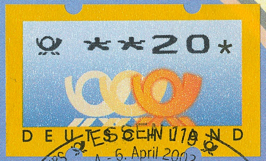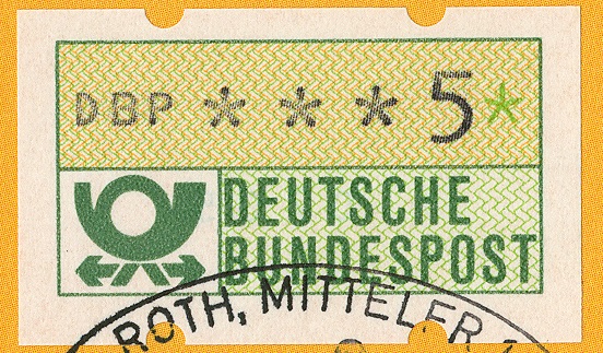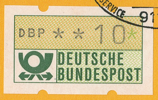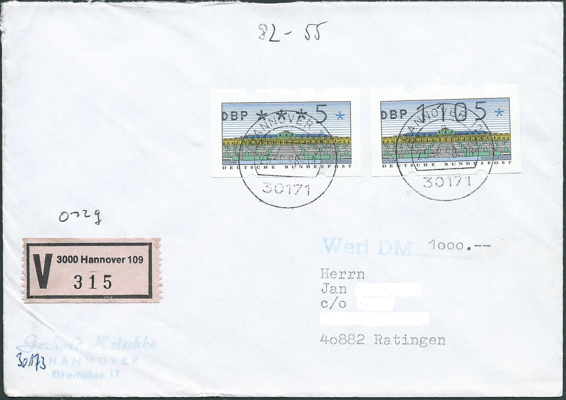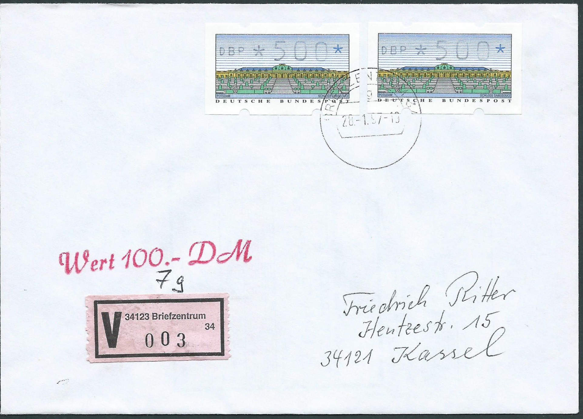 Den Anfang macht ein Einschreiben-Eilbrief mit einer ATM 1 zu 630 Pf. Da muss ich ehrlich gestehen, ich habe hier beim Kauf nicht auf die Portostufe geachtet, mich hat nur die hohe Wertstufe der ATM interessiert. Die sind sonst auch nicht so einfach zu finden. Dass der Beleg trotzdem vom Porto richtig ist, habe ich erst hier nachgeschlagen. 80 Pf Briefgebühr, dazu 2,-- DM Einschreiben und 3,50 DM Eilzustellung, macht genau 6,30 DM.