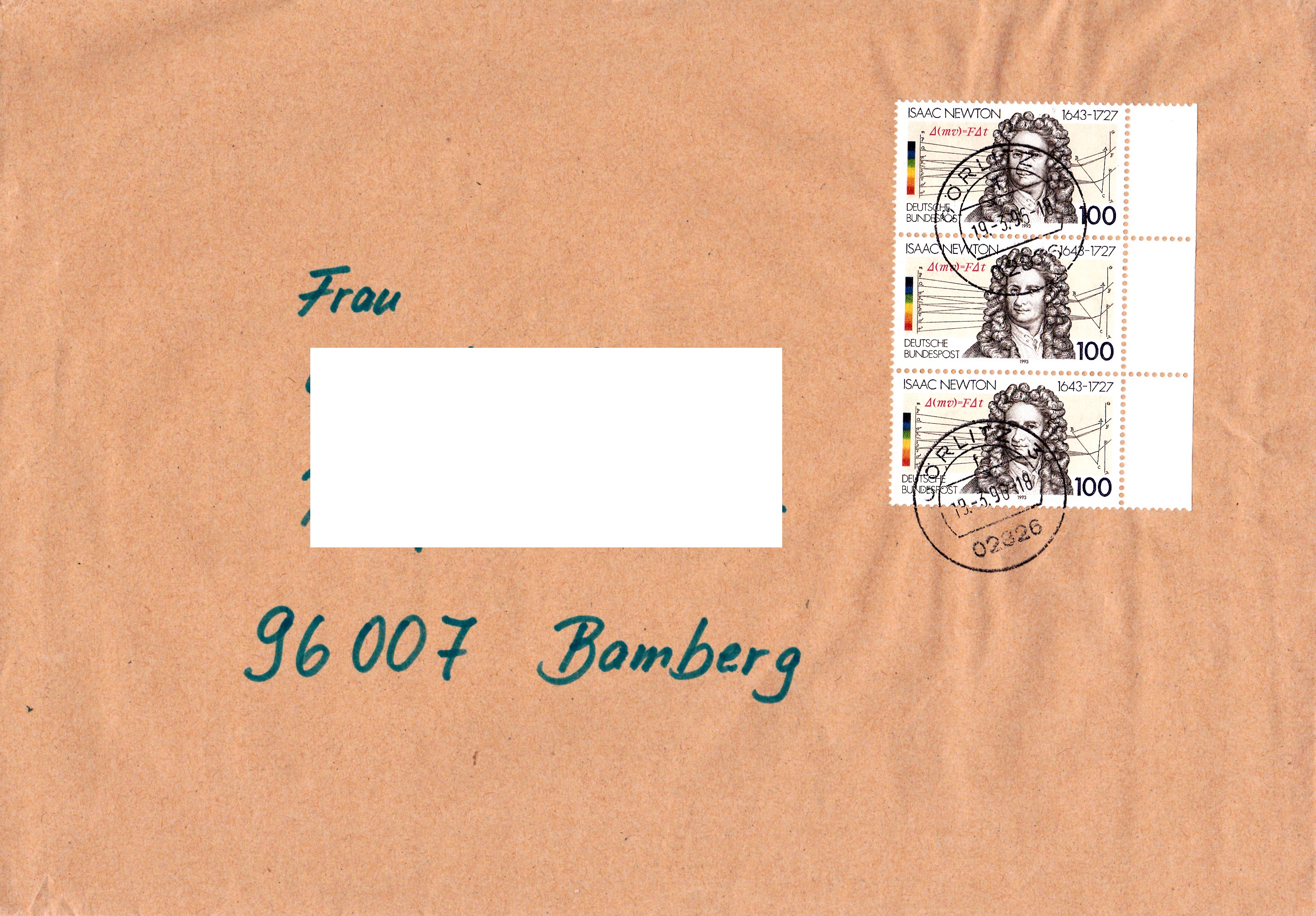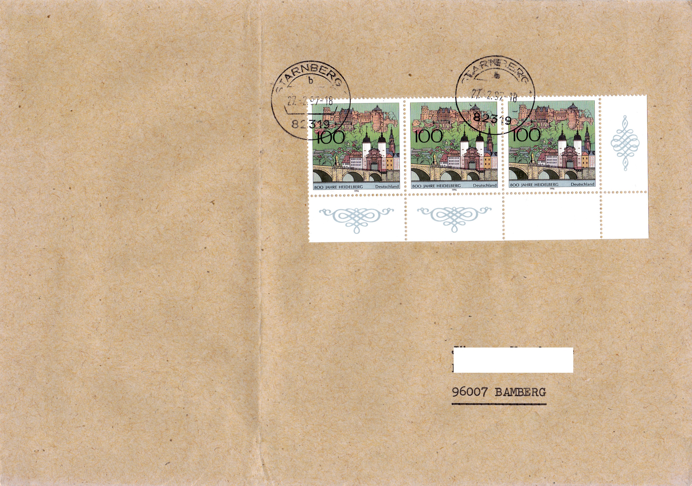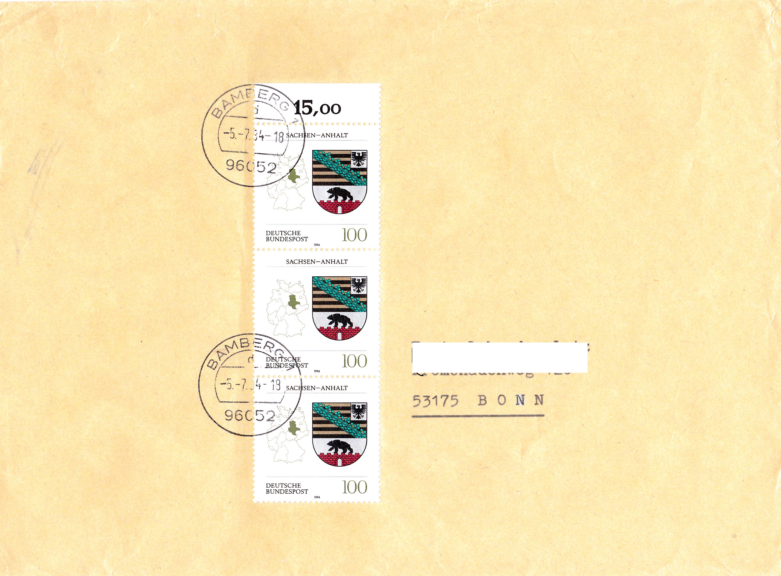 Zur Frankatur dieses Wertbriefes mit 121 g von Bamberg nach Loxstedt wurden am 20.7.1994 5 Marken MiNr 1735 (davon zwei mit anhängenden Blockteilen) aus Block 28 benutzt. Das Porto berechnet sich wie folgt: Brief 51 bus 500 g 300 Pf, Zusatzleistung Wert bis 600 DM 700 Pf, zusammen 1000 Pf.