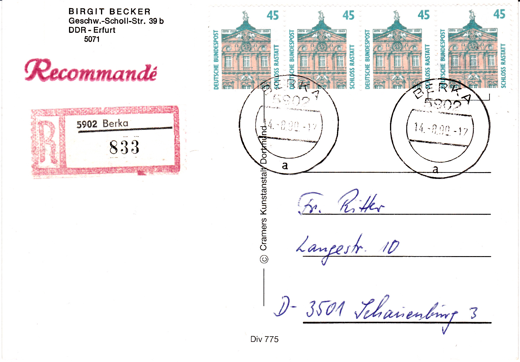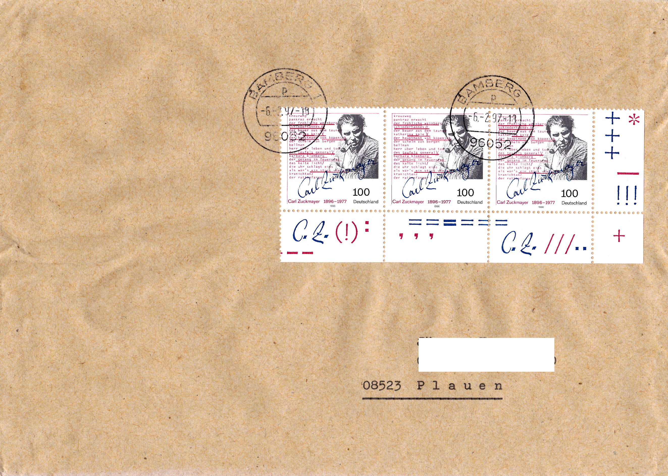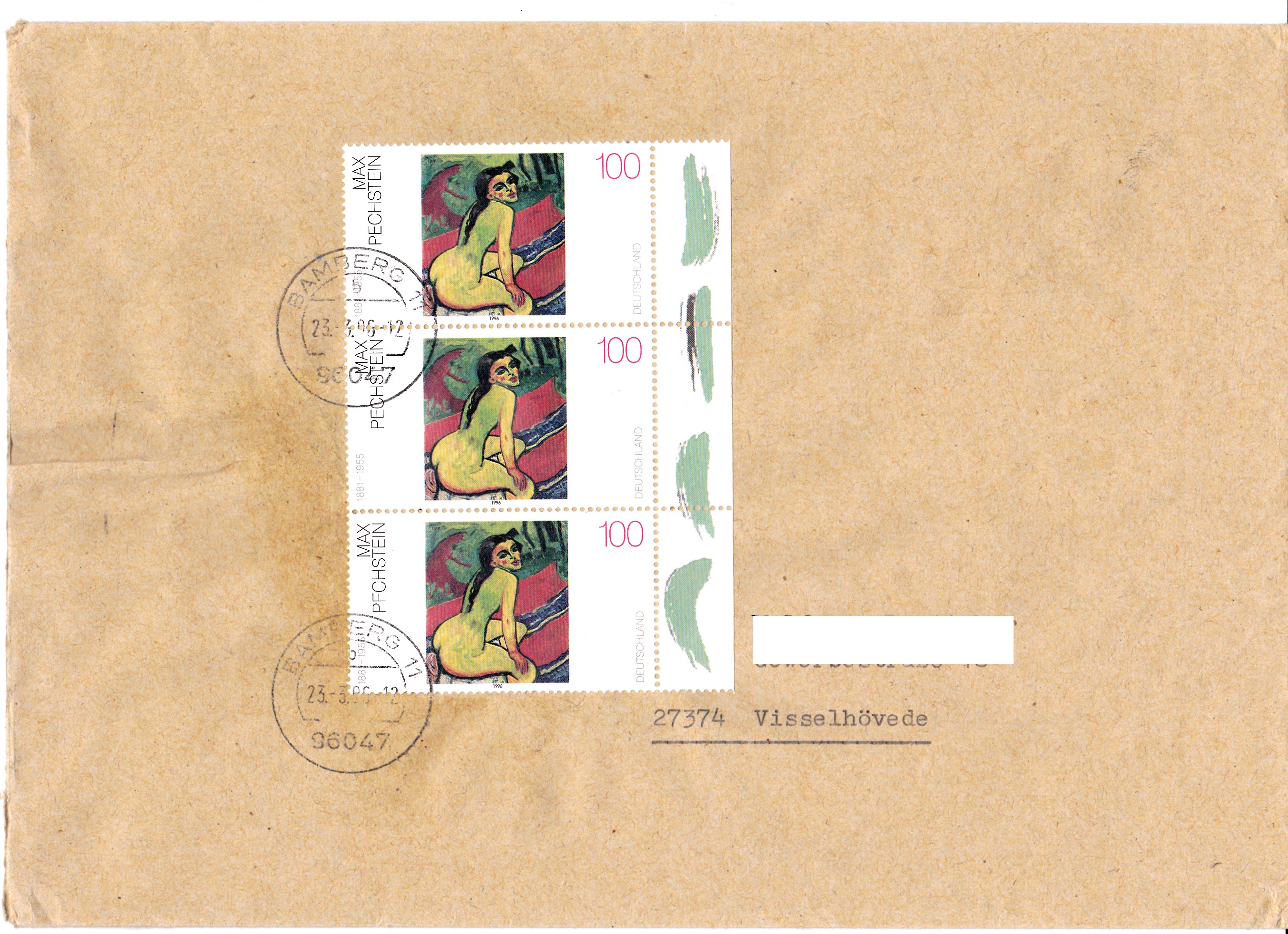 Zur Frankatur dieses Wertbriefes mit 121 g von Bamberg nach Loxstedt wurden am 20.7.1994 5 Marken MiNr 1735 (davon zwei mit anhängenden Blockteilen) aus Block 28 benutzt. Das Porto berechnet sich wie folgt: Brief 51 bus 500 g 300 Pf, Zusatzleistung Wert bis 600 DM 700 Pf, zusammen 1000 Pf.