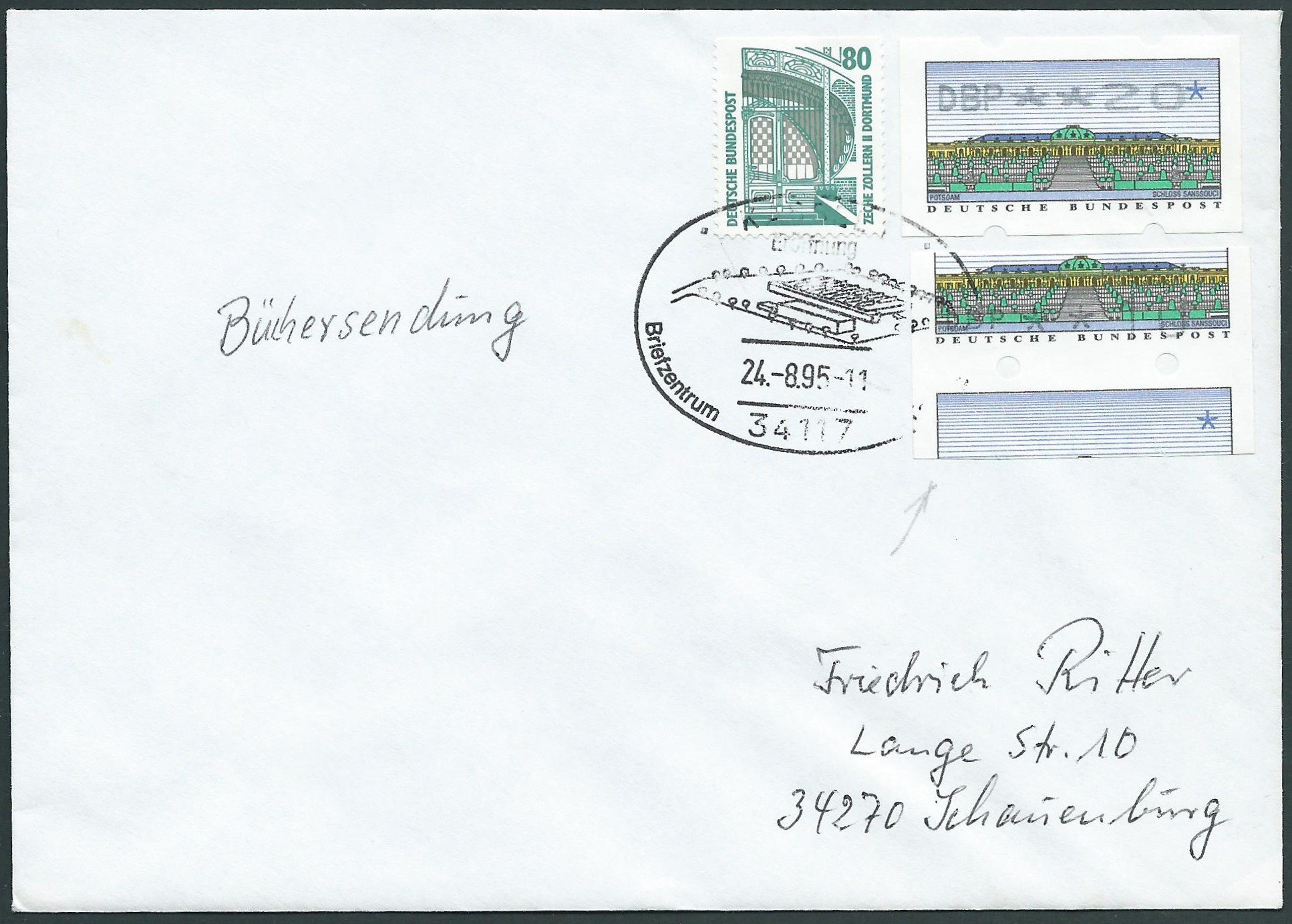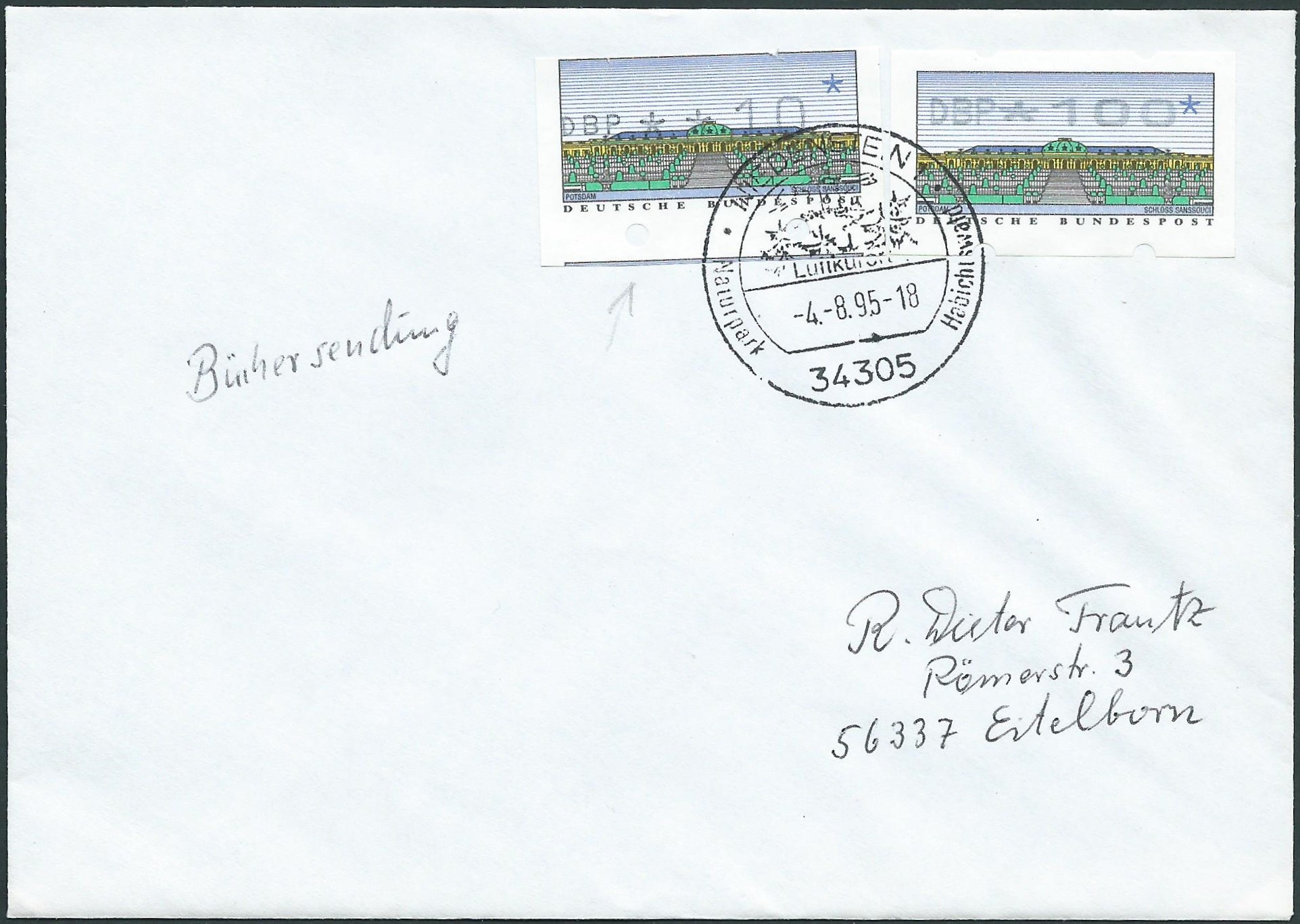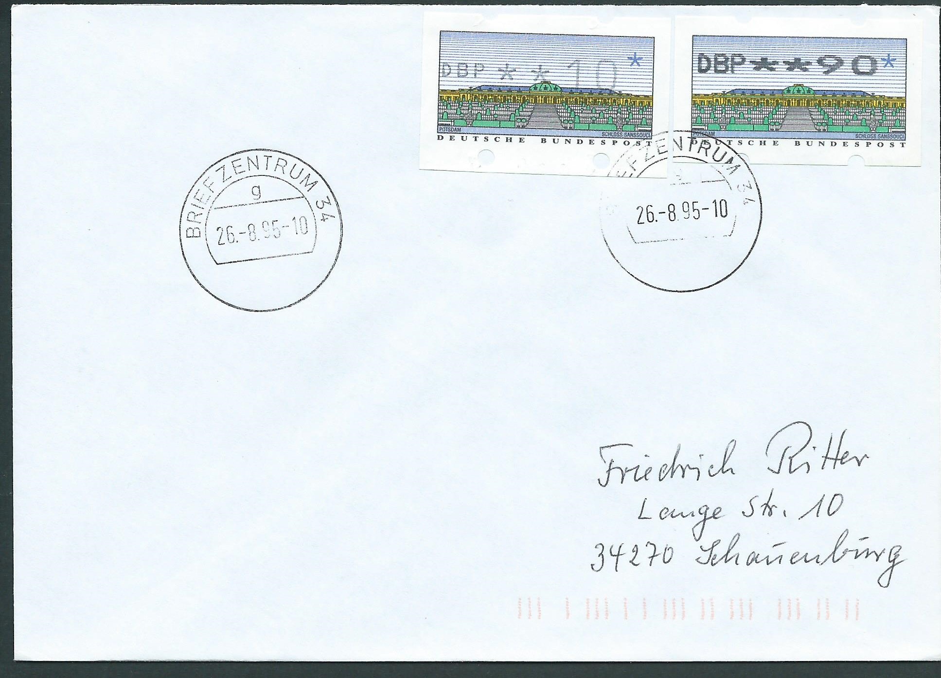 Nun wird es etwas "schräg": Hier folgen einige Beispiele für verschnittene ATM. Den Anfang darf eine ATM Mi. Nr. 2.1.1 machen, die die Transportlöcher genau in der Mitte hat. (Nebenfrankatur eine ATM 2.2.1 zu 20 Pf und eine SWK 80 Pf) Gestempelt wurde der Beleg in Kassel am 24.8.95 zur Einweihung des Briefzentrum 34.