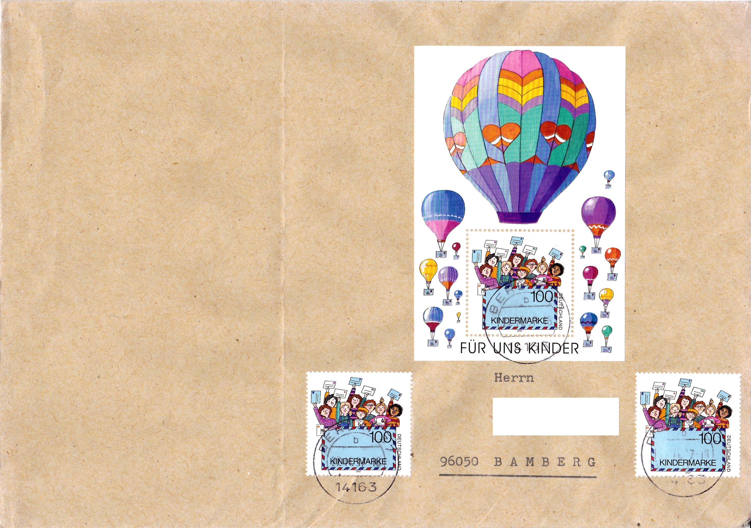 Obwohl diese Beleg auch keine "echte" Mehrfachfrankatur darstellt, wikk ich ihn hier zeigen: Blockausgabe "Für uns Kinder" (MiNr Block 40) sowie zwei einzelne Marken aus diesem Block (MiNr 1933) portogerecht auf einem Brief vom 27.11.1997 nach Bamberg.