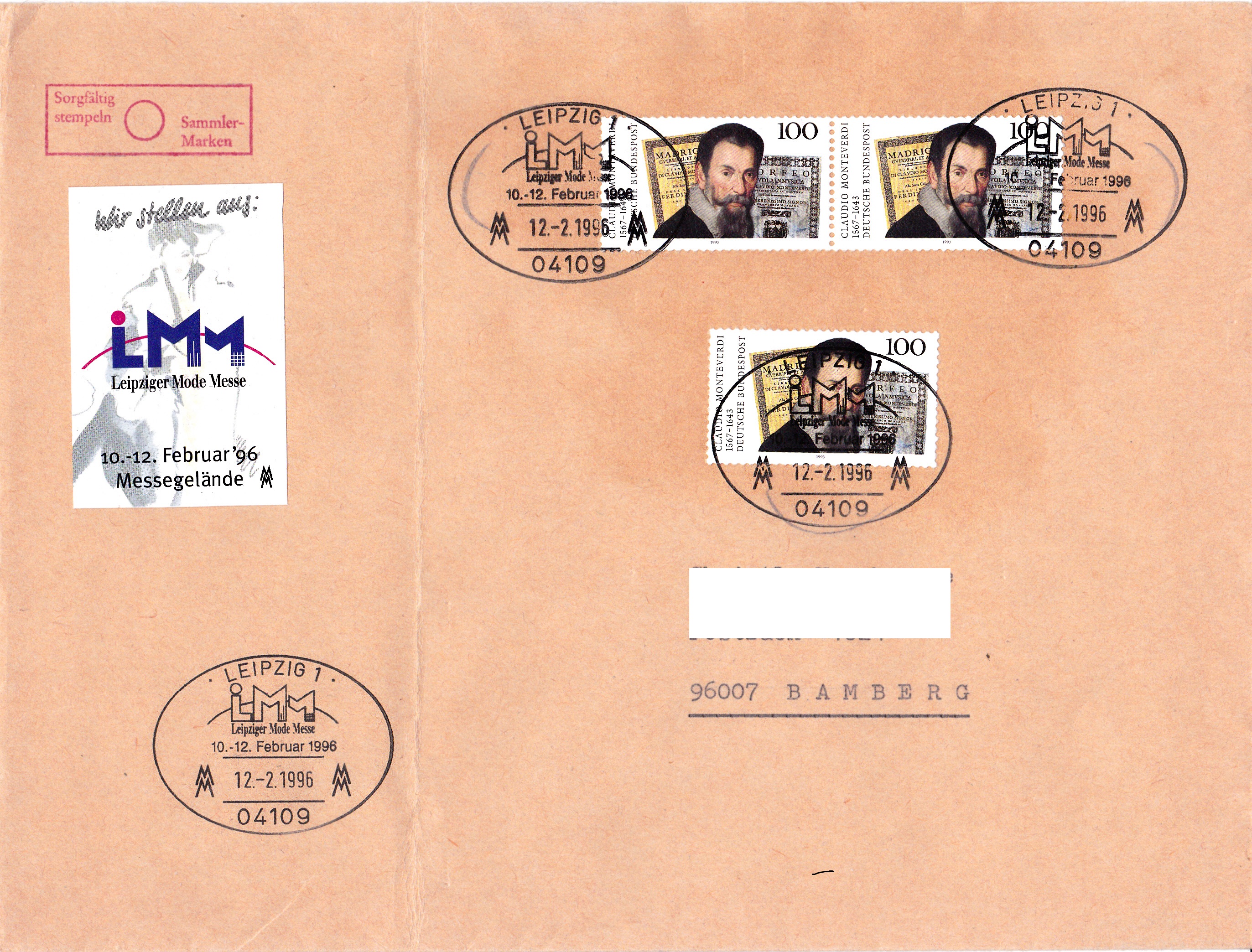 Drei Werte der Sondermarke "350. Todestag von Claudio Monteverdi" portogerecht auf einem Brief von 51 bis 500 g vom 12.2.1996 nach Bamberg. Die Marken sind mit einem Sonderstempel aus 04109 Leipzig 1 zur Leipziger Mode Messe abgestempelt worden.