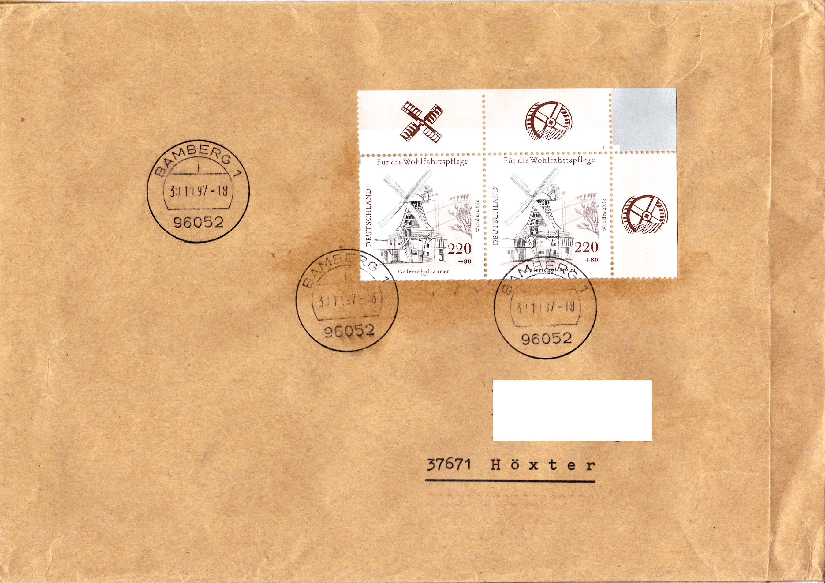 Waagerechtes Paar vom rechten oberen Bogenrand der 220 PF + 80 Pf Wohlfahrtsmarke aus dem Jahre 1997 auf einem portogerechten Brief von 501 bis 1000 g nach Höxter. Seit dem 1.9.1997 betrug das Porto dafür 440 Pf (bis zum 31.12.2001).