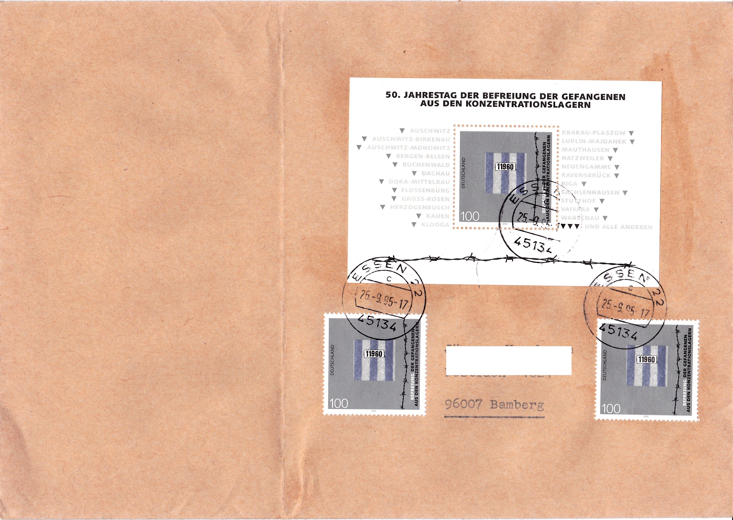 Auf diesem Brief von 51 bis 500 g von Essen nach Bamberg sind einmal Block 32 "50. Jahrestag der Befreiung der Gefangenen aus den Konzentrationslagern" und zweimal eine aus dem Block herausgetrennte Marke MiNr 1796 portogerecht verklebt.
