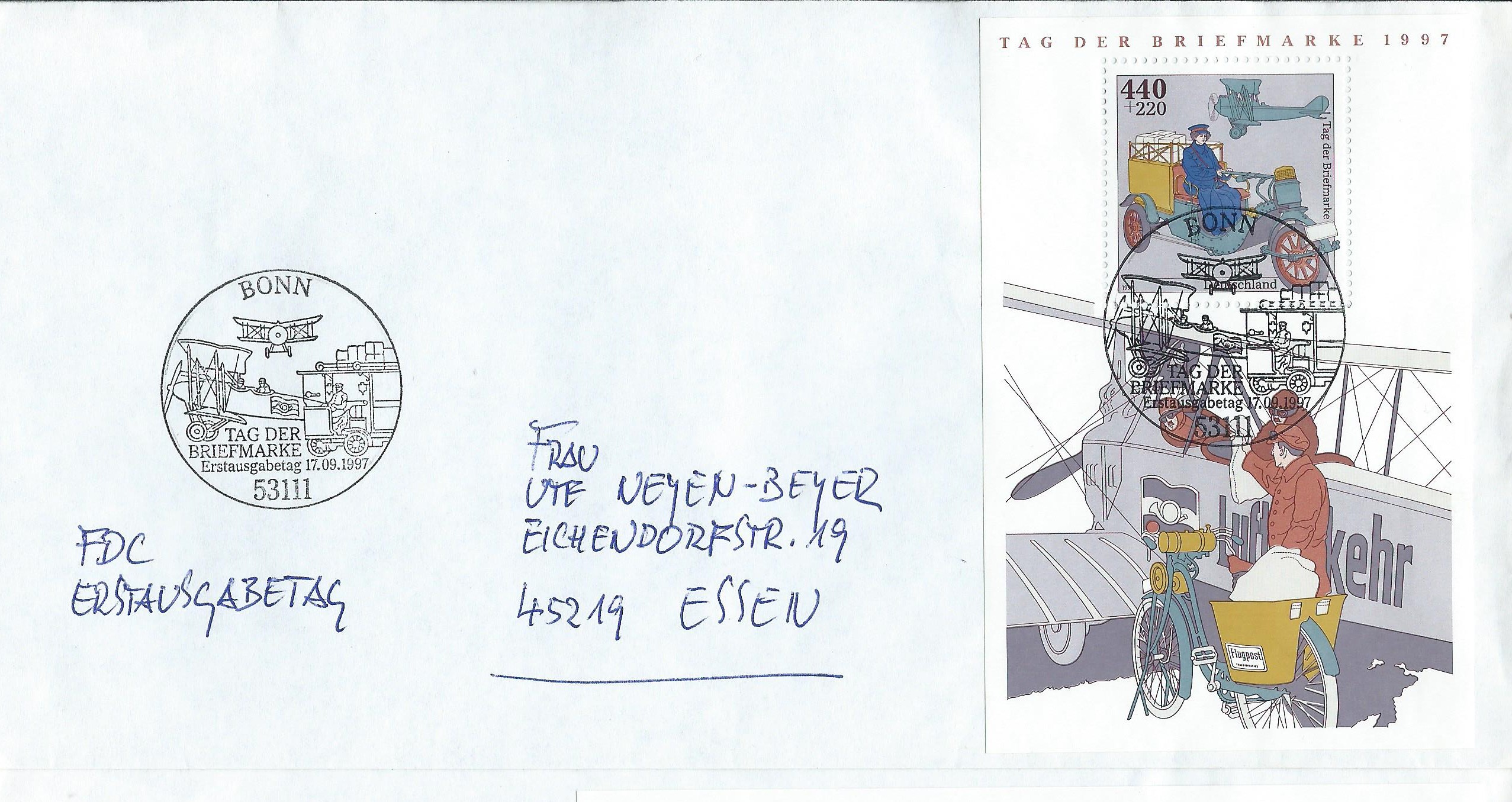 Auch der nächste Ersttagsbrief ist mit 4,40 DM hoffnungslos überfrankiert. Block 41 klebt auch wieder auf einem länglichen Umschlag, gestempelt wurde hier am 17.9.97 mit dem Ersttagssonderstempel Bonn.