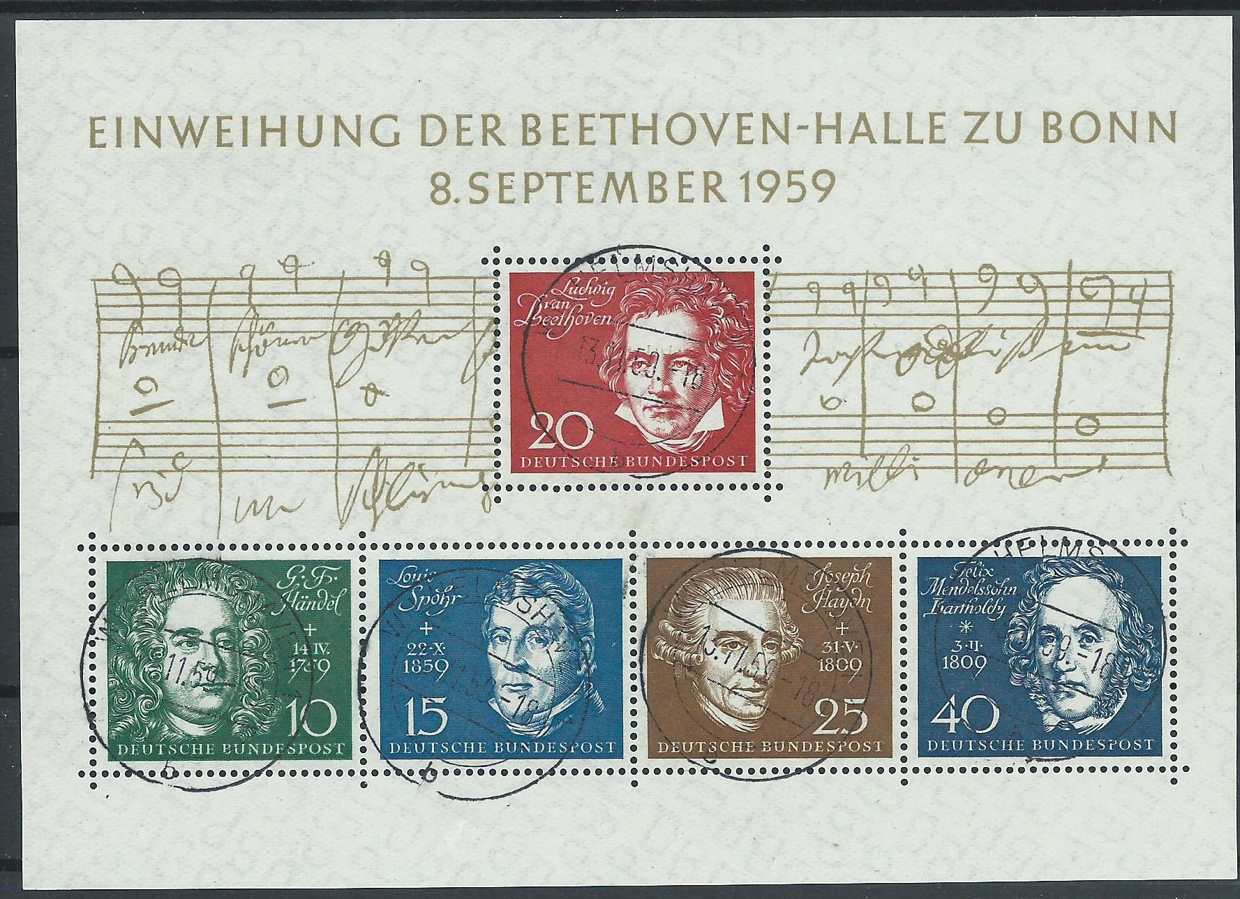 der Block 2 der Bundesrepublik „Einweihung der Beethoven-Halle Bonn“ wurde am Anfang schon einmal gezeigt. Mir ist jetzt ein besonders schöner Block in die Hände gefallen. Er hat auf jeder Marke einen Vollstempel von Wilhelmshaven vom 13.11.59. So „voll“ gestempelte Blocks sind natürlich immer ein Augenschmaus in der Sammlung.