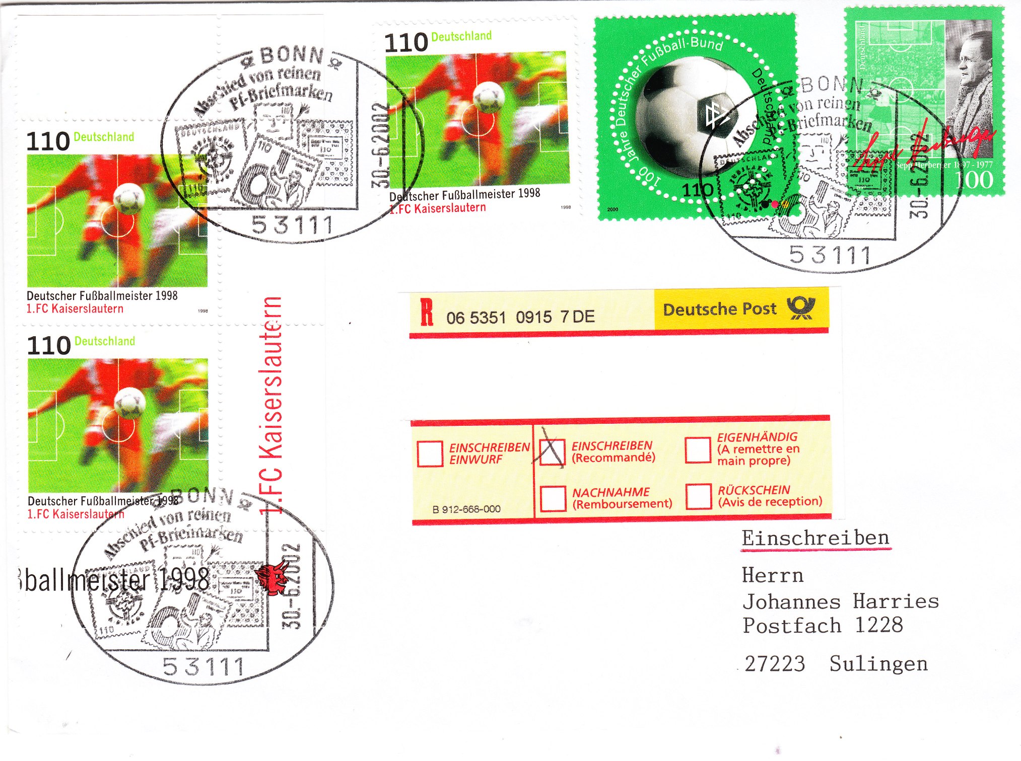 Dieser Beleg wurde mit lauter Marken zum Thema Fußball frankiert und in Bonn mit einem thematisch zum Thema passenden Sonderstempel "Abschied von reinen Pf-Briefmarken" entwertet.