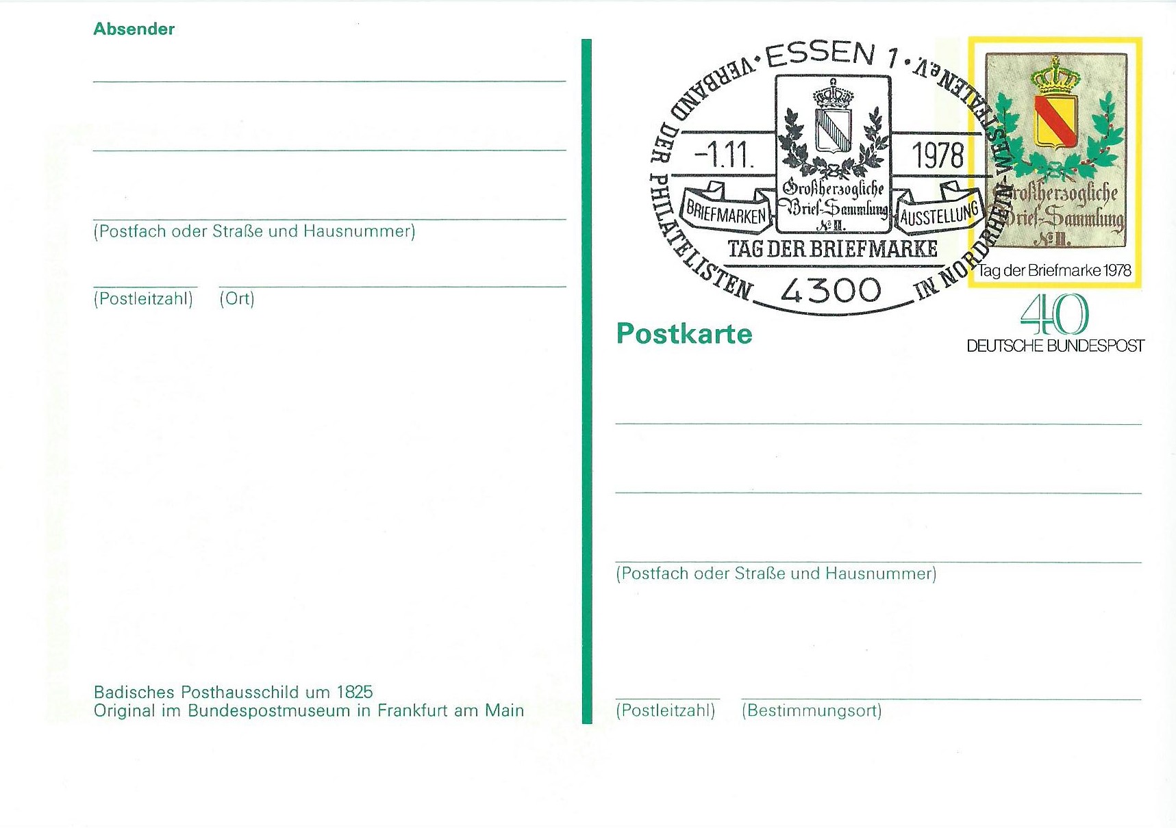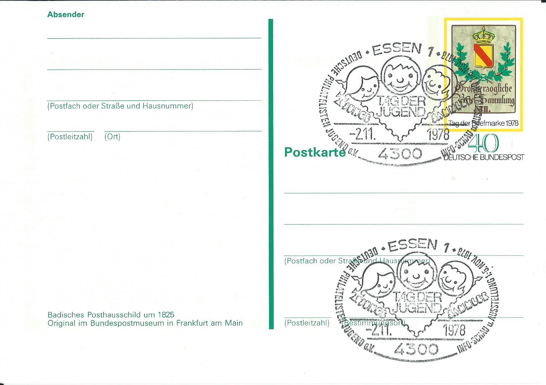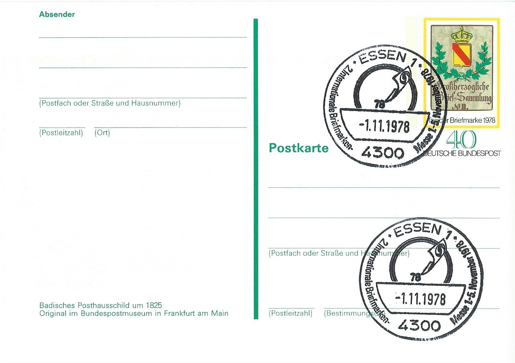 Zuerst möchte ich die Postkarte mit der 40 Pf-Ausgabe zum Tag der Briefmarke 1978 vorstellen. Sie zeigt als Wertstempel die bildgleiche Marke mit dem Badischen Posthausschild. Im Michel-Ganzsachenkatalog wird sie als PSo 5 gelistet. Überwiegend wurde sie von Sammlern als Sonderstempel-Vorlage genutzt, das soll auch im Anschluss dokumentiert werden. Es gibt sie aber auch als Bedarfsverwendung, wie im folgenden ersten Bild zu sehen ist. Hier wurde sie für ein Preisausschreiben genutzt und mit dem Maschinenstempel Essen vom 13.12.78 gestempelt.