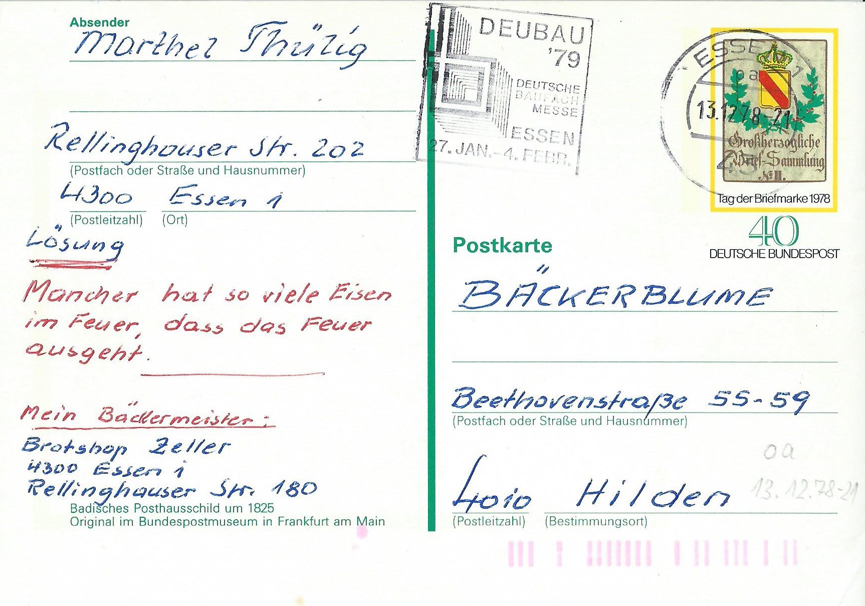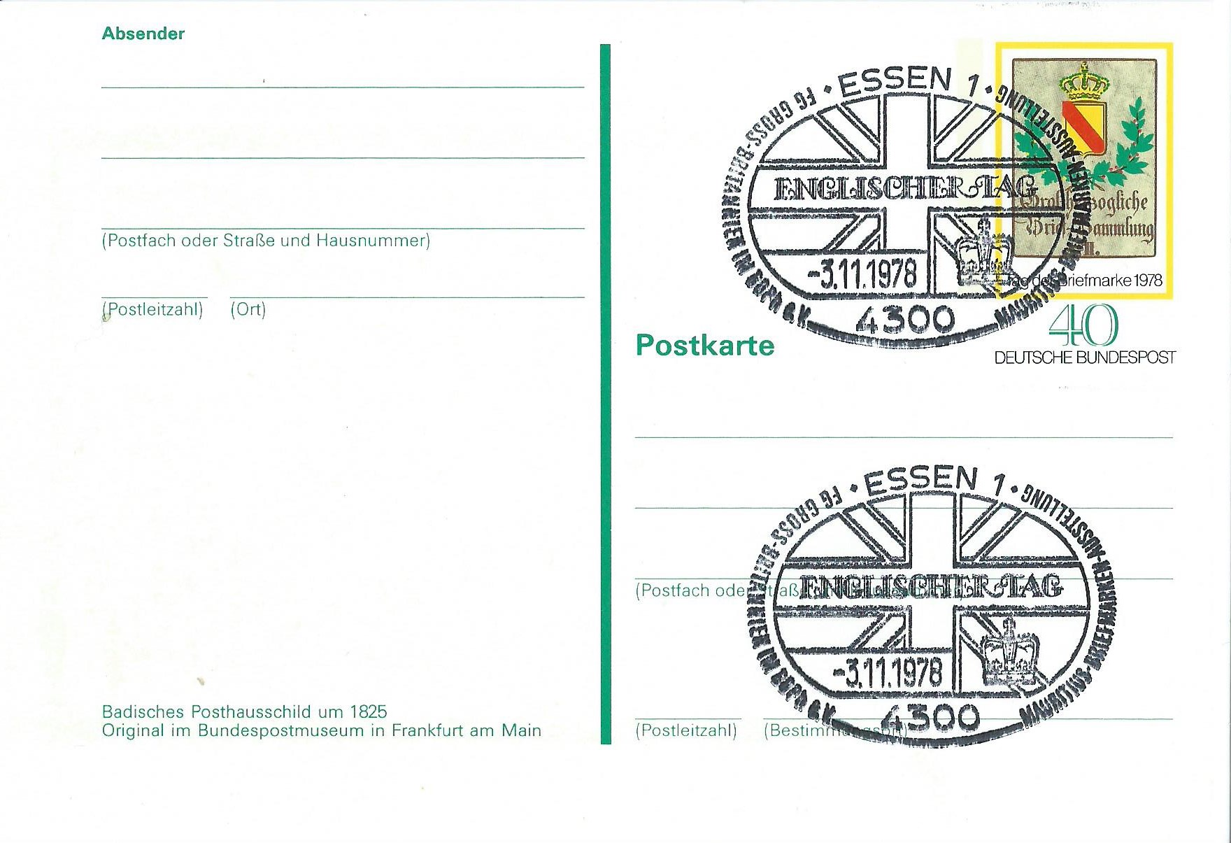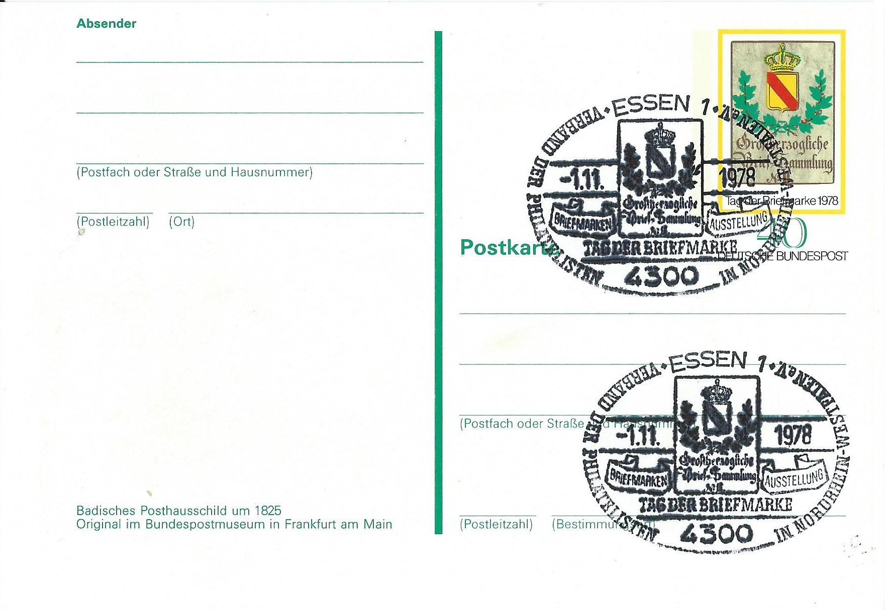 Zuerst möchte ich die Postkarte mit der 40 Pf-Ausgabe zum Tag der Briefmarke 1978 vorstellen. Sie zeigt als Wertstempel die bildgleiche Marke mit dem Badischen Posthausschild. Im Michel-Ganzsachenkatalog wird sie als PSo 5 gelistet. Überwiegend wurde sie von Sammlern als Sonderstempel-Vorlage genutzt, das soll auch im Anschluss dokumentiert werden. Es gibt sie aber auch als Bedarfsverwendung, wie im folgenden ersten Bild zu sehen ist. Hier wurde sie für ein Preisausschreiben genutzt und mit dem Maschinenstempel Essen vom 13.12.78 gestempelt.