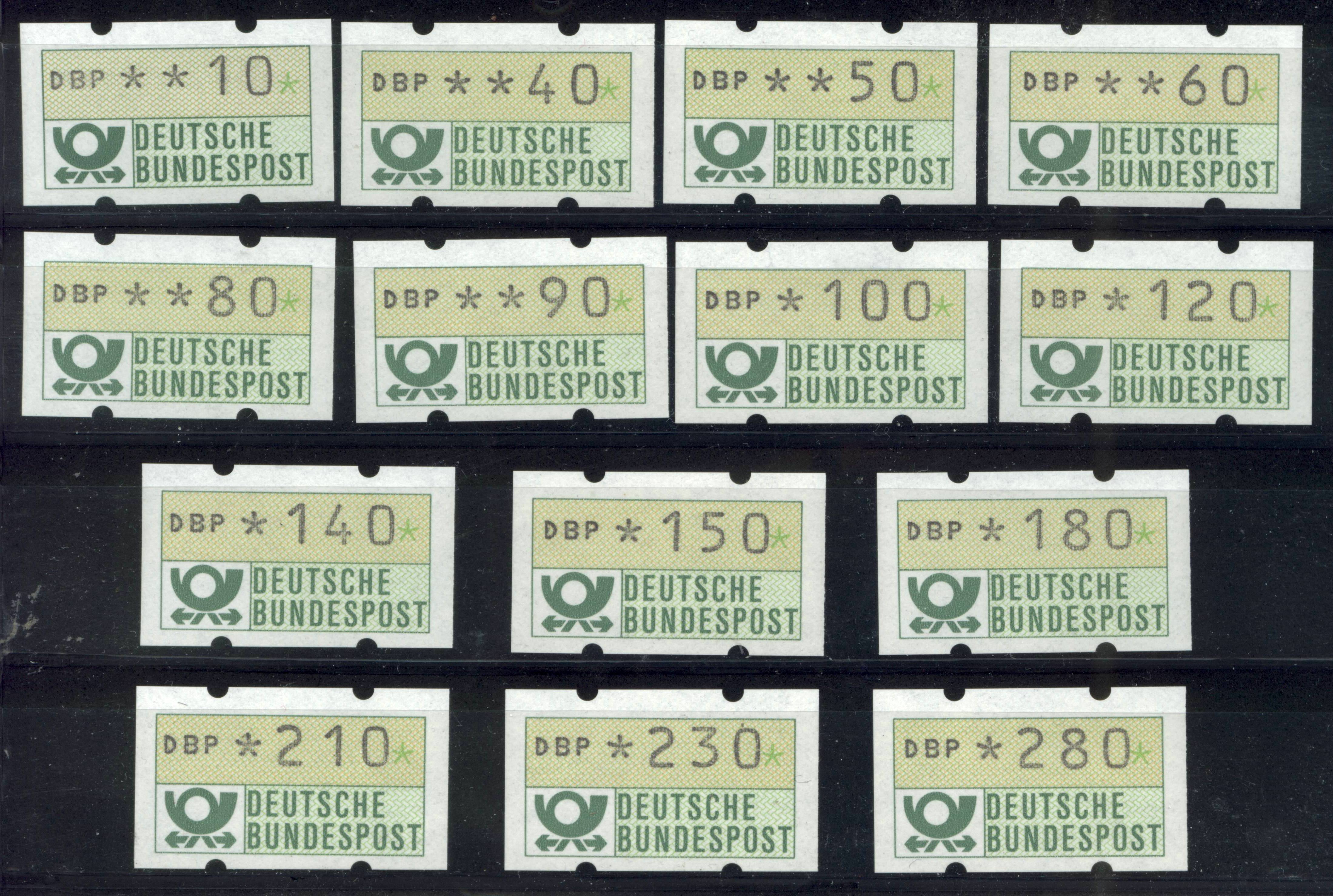 Am 2.1.1981 gab die Deutsche Bundespost die ersten sogenannten Automatenmarken heraus. Damals war ein fester "Tastensatz" im Automaten erhältlich und ein neues Sammelgebiet wurde geboren. Diese Automaten standen dem Postkunden direkt zur Verfügung. Hier einmal der erste Satz mit den fest einprogrammierten Wertstufen im Bild: