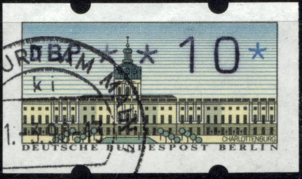 Das waren die bislang verausgabten Automatenmarken der Deutschen Bundespost bzw. Deutschen Post AG. Die Deutsche Bundespost Berlin hat ab dem 4.5.1987 ebenfalls eigene Automatenmarken verausgabt, diese auch wieder in Wertstufen von 5 bis 9995 Pf. Hier ein Beispielwert mit Motiv Schloss Charlottenburg: