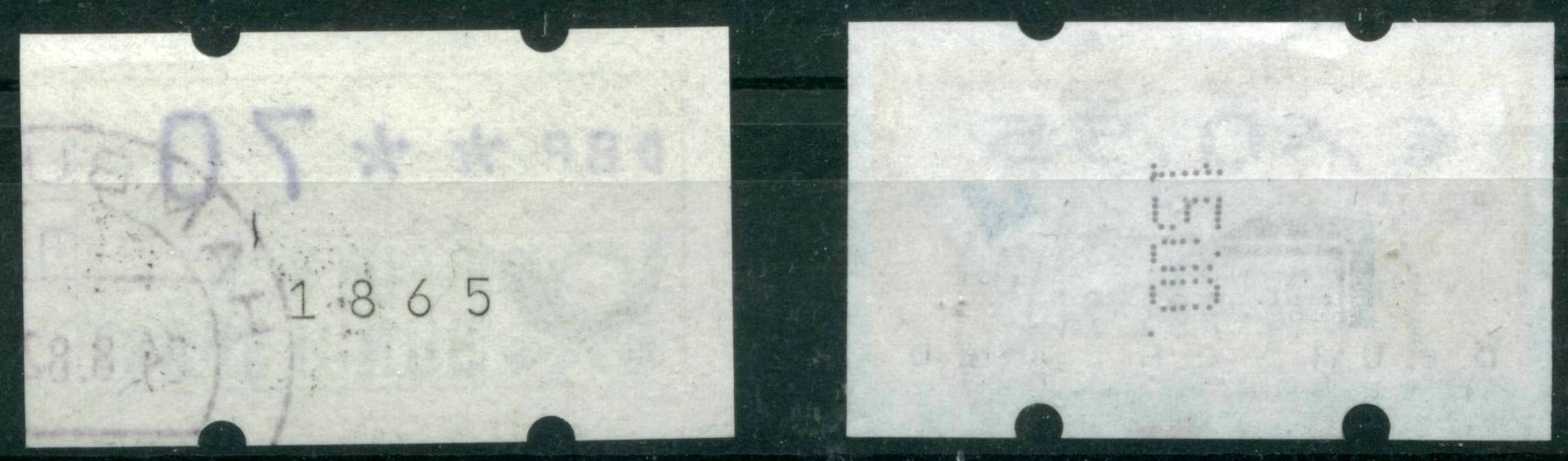 Weiter oben hatte ich schon geschrieben, dass die Automatenmarken auf Rollen wären. Die komplette Rolle hat 2000 Vordruck-Felder, die dann im Automaten mit der gewünschten Wertstufe bedruckt und zur Ausgabe abgeschnitten werden. Zur vereinfachten Feststellung, wieviele Vordrucke nochauf der eingelegten Rolle sind, trägt jeder 5. Vordruck eine Zählnummer, genau wie die "normalen" Rollenmarken. Anfangs waren es wagerechte kleine Nummern, später (wie auch bei den Rollenmarken Sehenswürdigkeiten) kamen die senkrechten grossen gepunkteten Nummern zum Einsatz. Hier einmal die Nummerntypen im Bild vorgestellt: