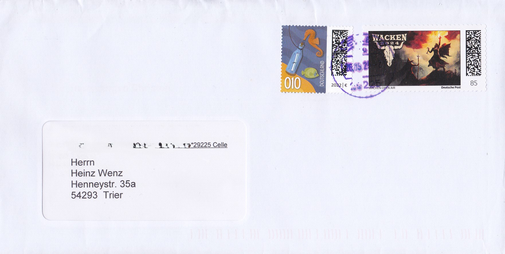 Auf diesem Umschlag von Celle nach Trier wurde die Mark zum Wacken Open Air 2024 zu 85 Cent mit dem Jahresmotiv 2024 "Witches & Warlocks" zusammen mit einer Marke zu "010 Cent" aus der DS "Welt der Briefe" zur Frankatur verwendet.