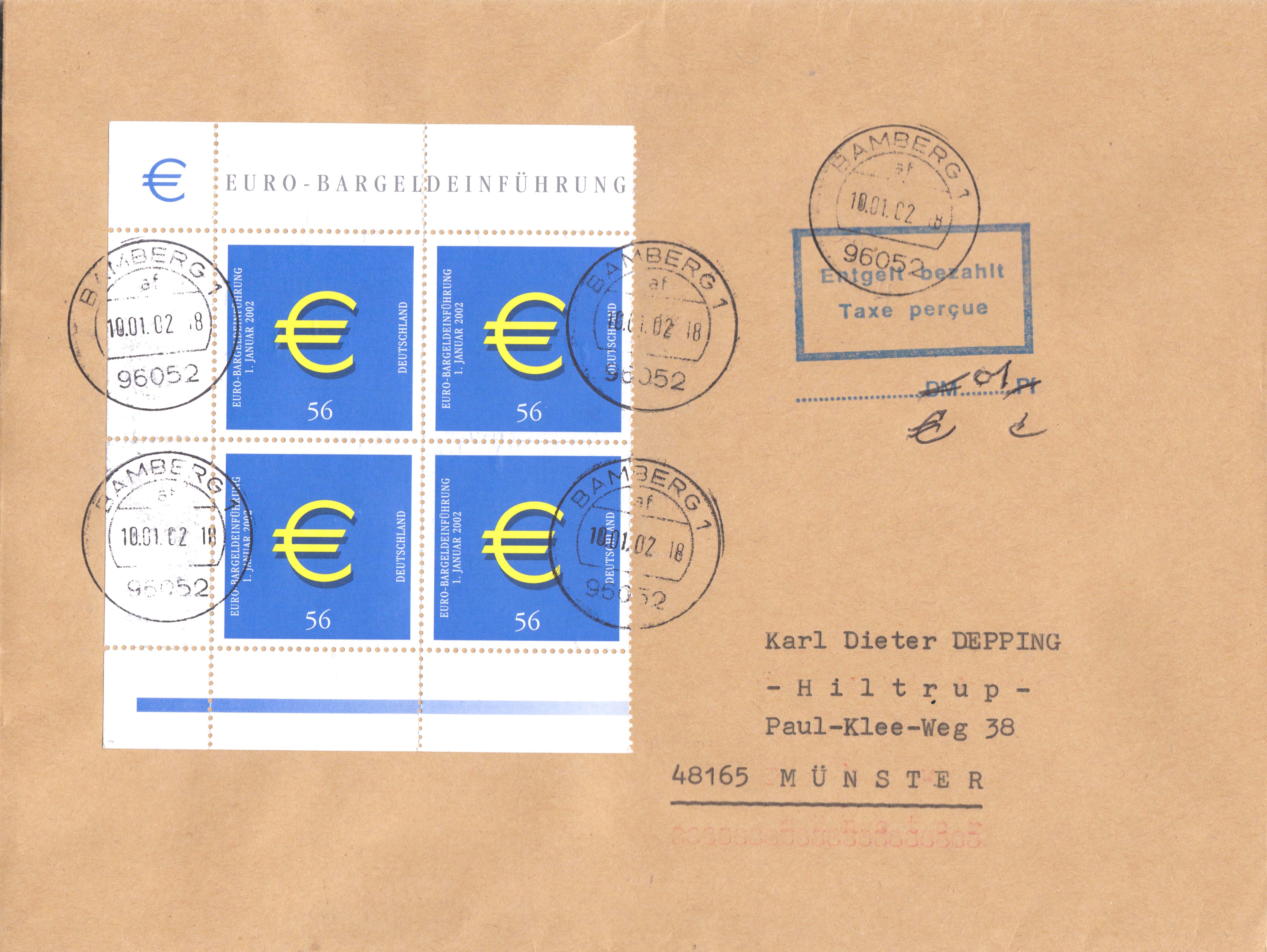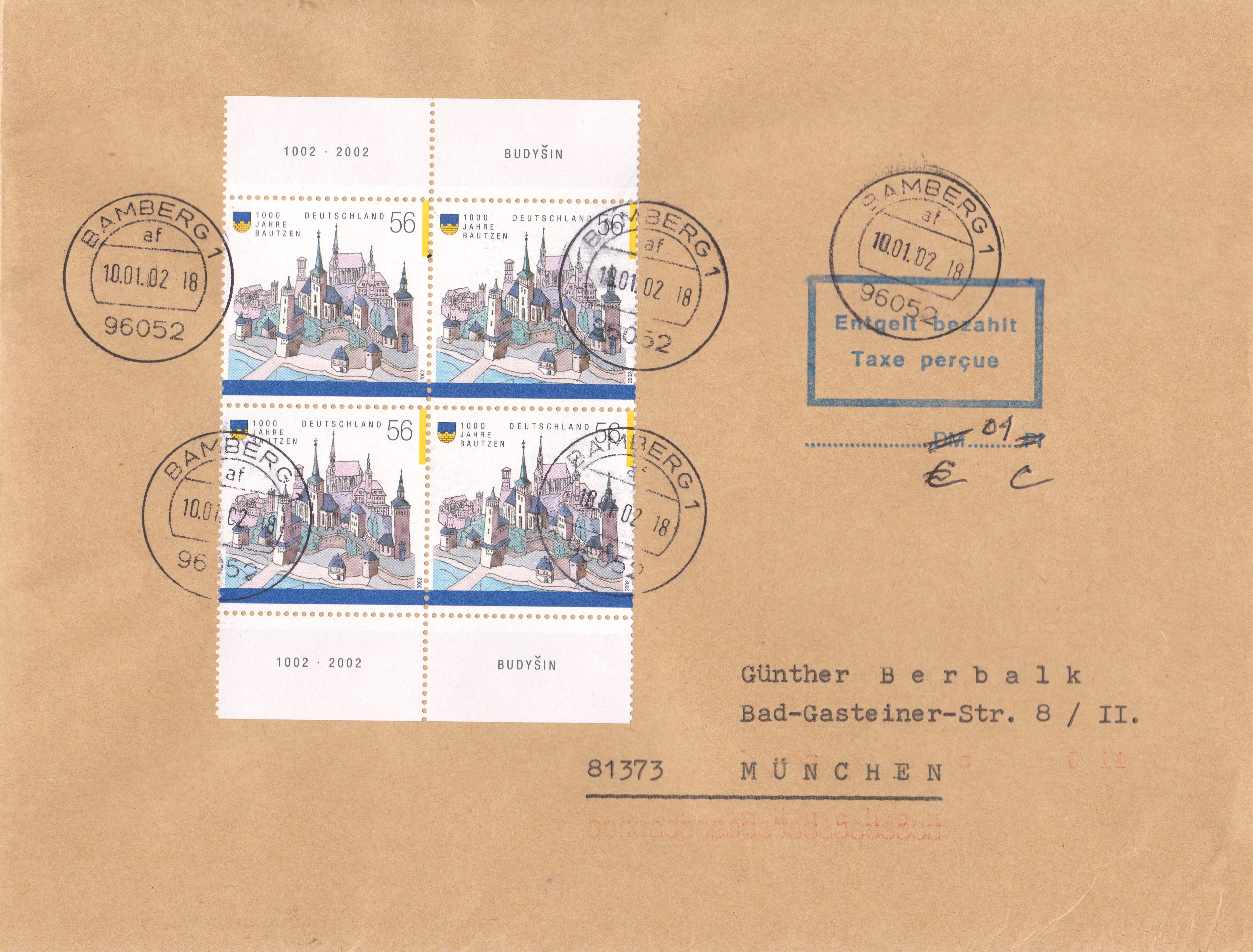 Der somit zur Erfüllung der Portostufe von 2,25 € fehlende 1 Cent wurde bei Einlieferung am 10.01.2002 in 96052 BAMBERG 1 am Postschalter bar bezahlt.