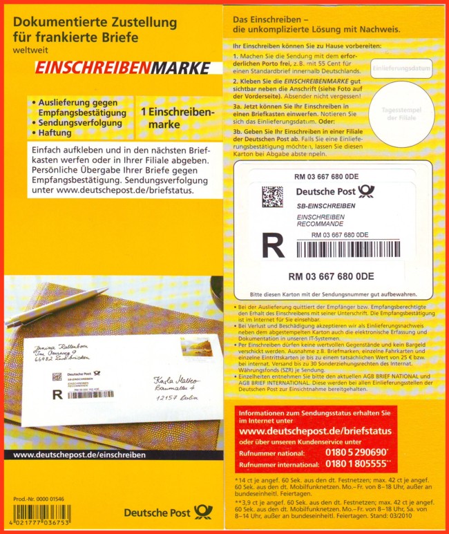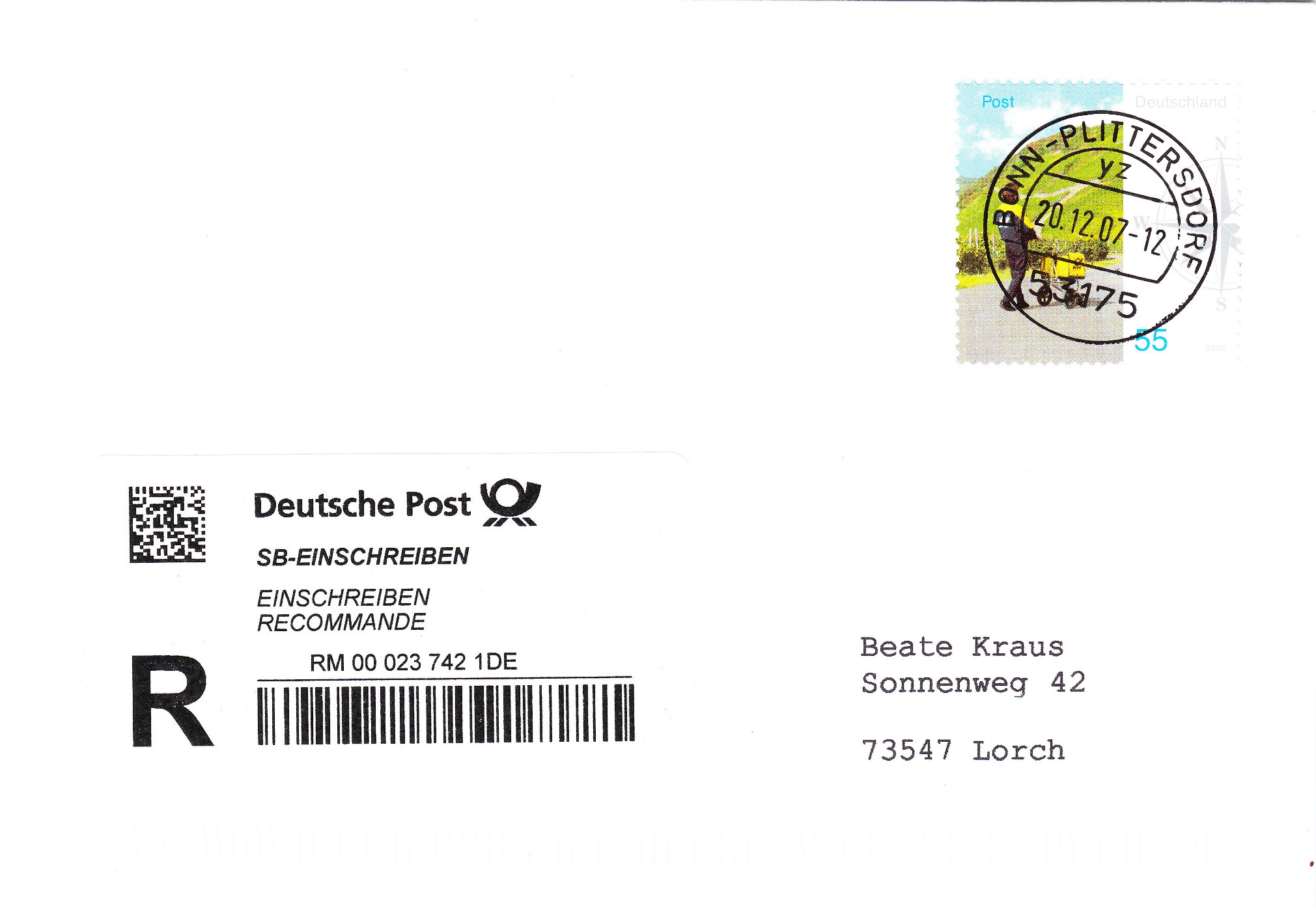 Seit April 2007 gibt es die Einschreibenmarke, mit der man Sendungen von zu Hause aus als Einschreiben versenden kann, indem man diese Sendungen als Brief frankiert und einfach in den nächsten Postkarten einwirft: