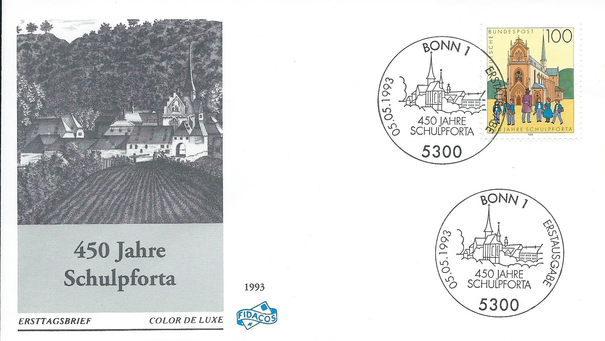 hier kann ich einen Ersttagsbrief der Marke Mi.Nr. 1675 „Schulpforta“ zeigen. Die Marke wurde mit dem passenden Ersttagsonderstempel Bonn vom 5.5.93 gestempelt.