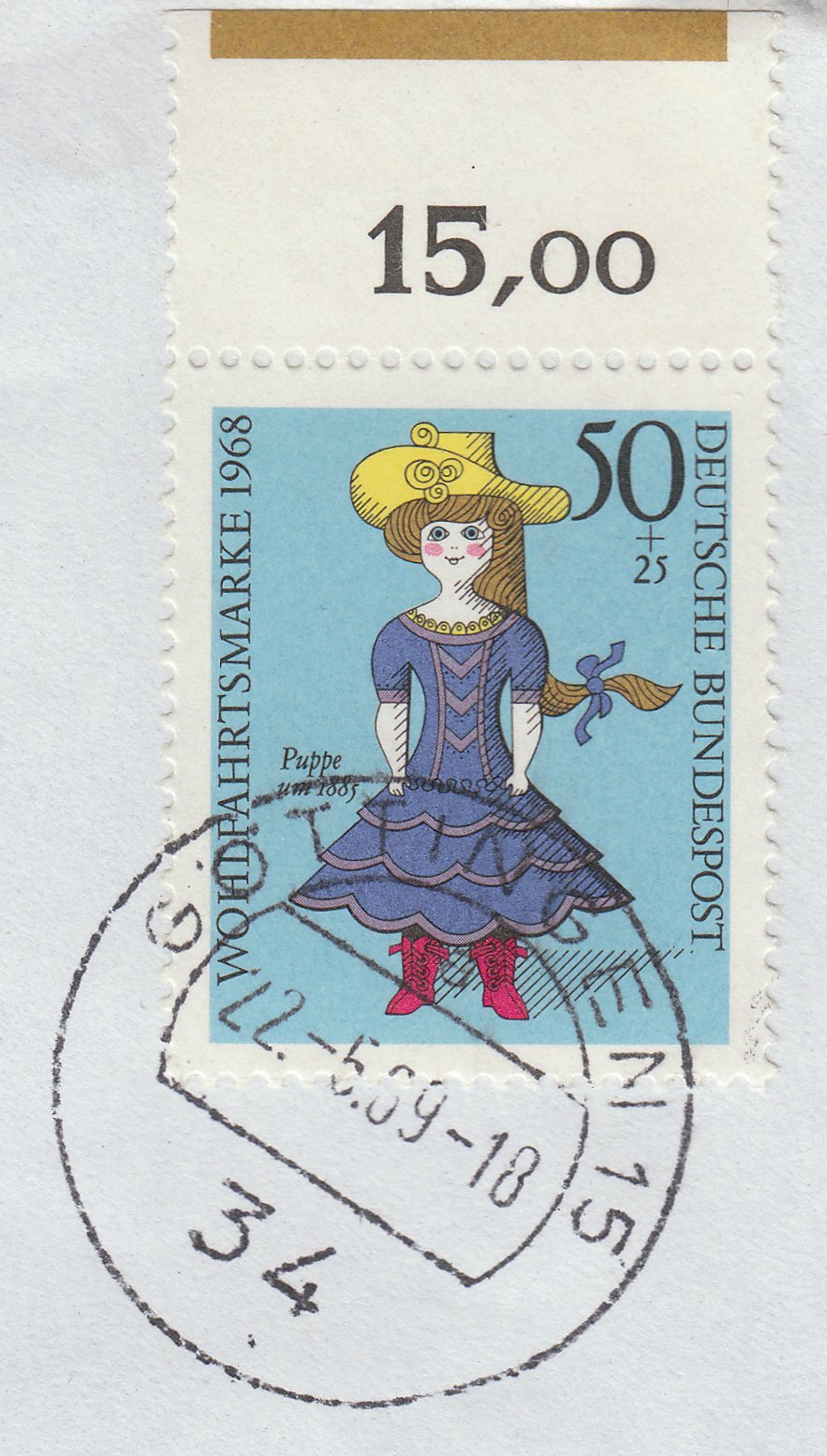 Wohlfahrtsmarke 1968 mit Nennwert 50 + 25 Pf, Bund MiNr. 574, als Oberrandstück mit Farbrandstreifen sowie Wohlfahrtszähnung im Oberrand, am 22.05.1969 auf Briefstück mit Tagesstempel Göttingen: