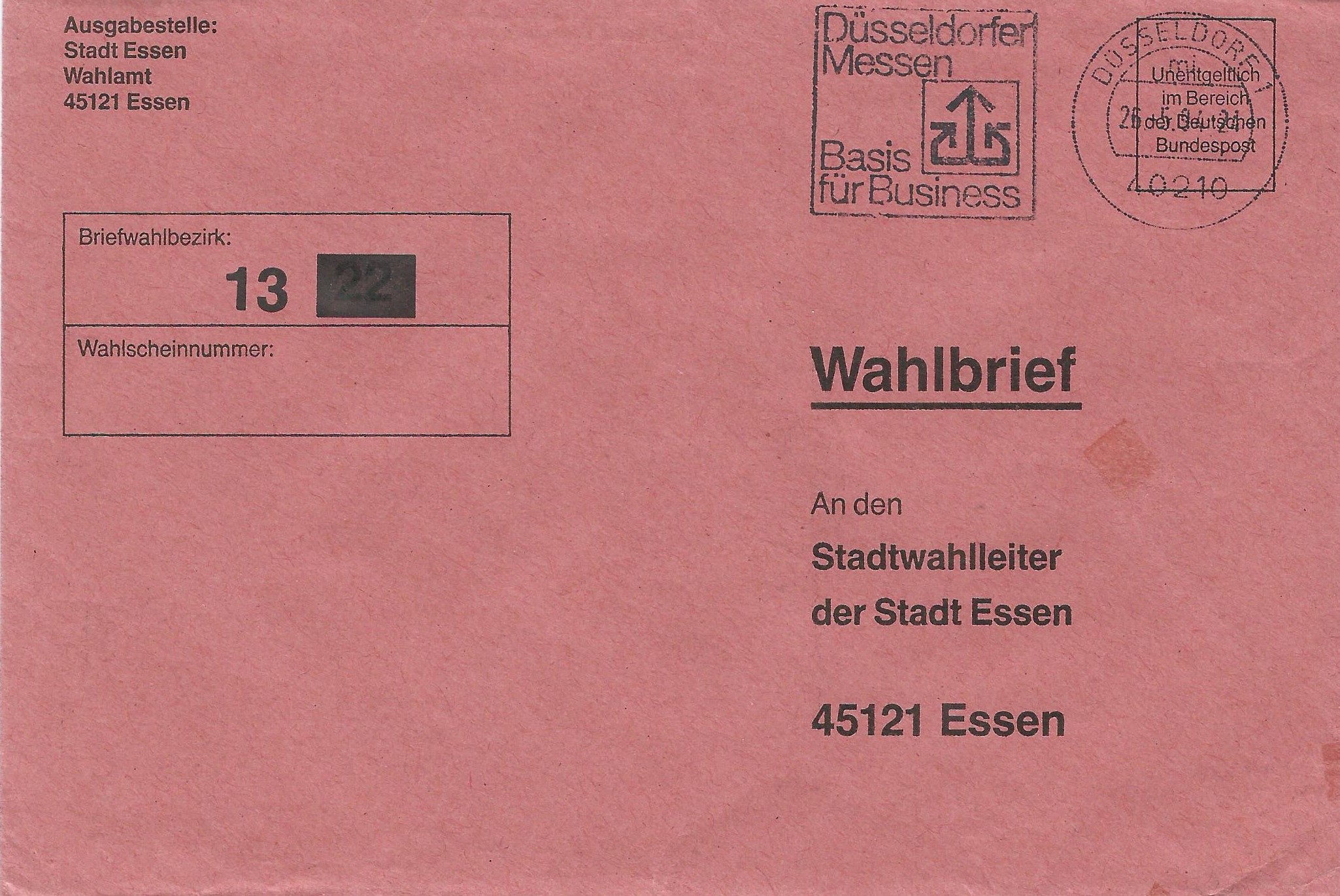 Los geht es mit einem Beleg, der in Essen am 12.9.89 mit der Maschine gestempelt wurde. Er ging an den Wahlbezirk 32. Besonders interessant ist der kopfstehende Werbeeinsatz!