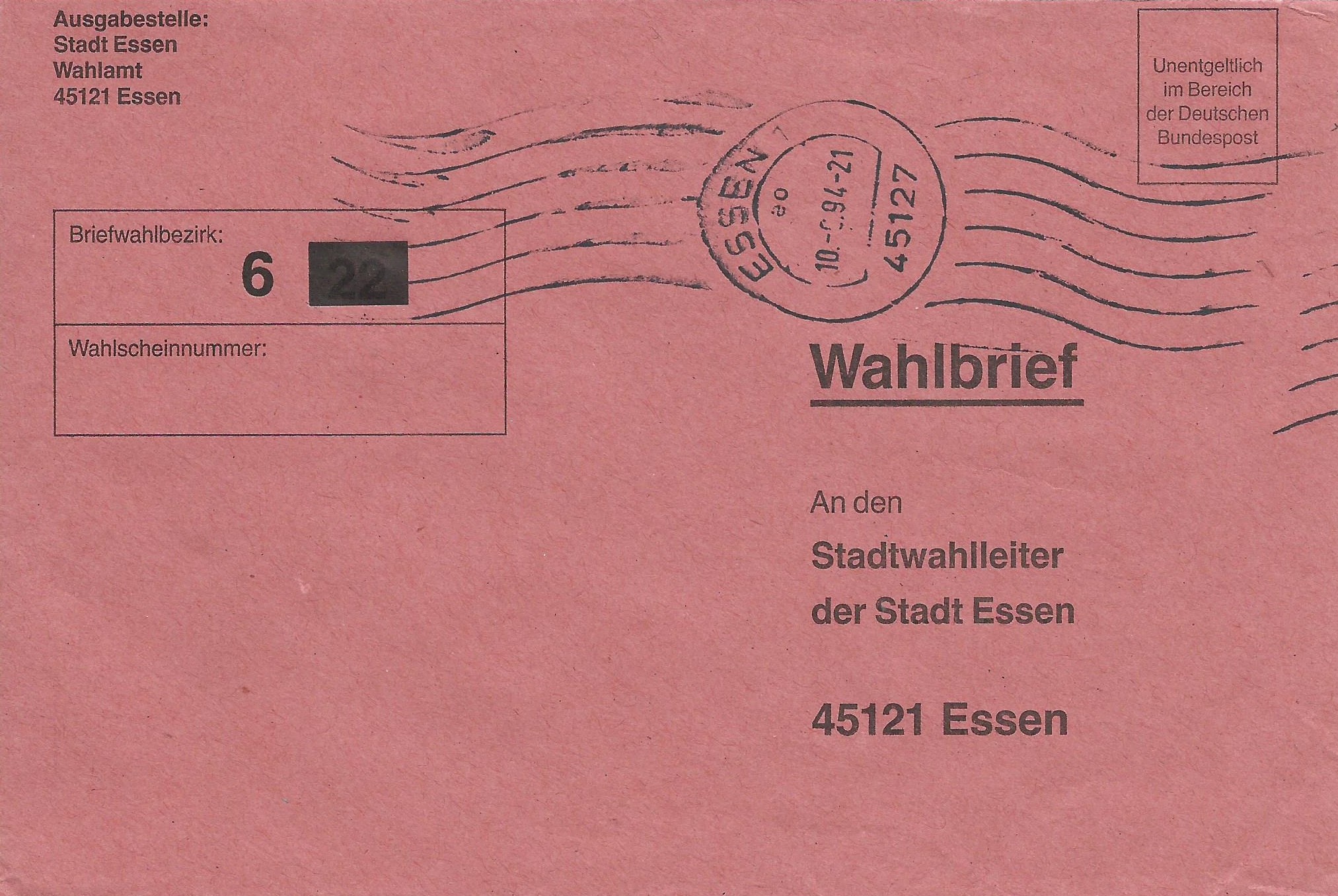Und der letzte mir vorliegende Wahlbrief, wiederum mit einem Handrollstempel, datiert vom 9.6.94 und war ebenfalls für den Briefwahlbezirk 11 bestimmt.