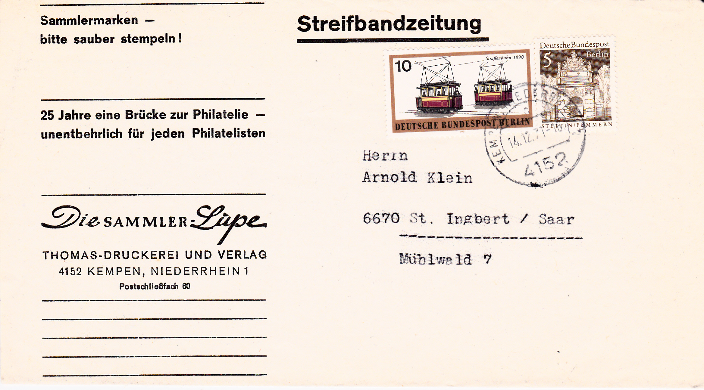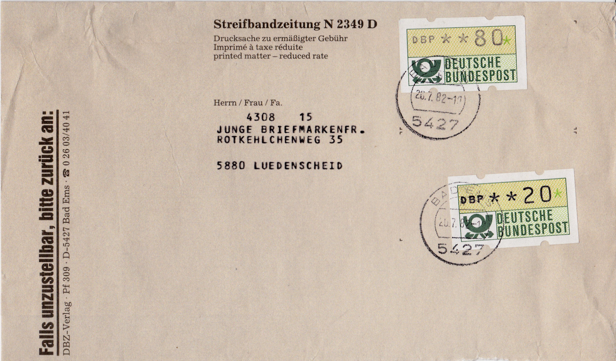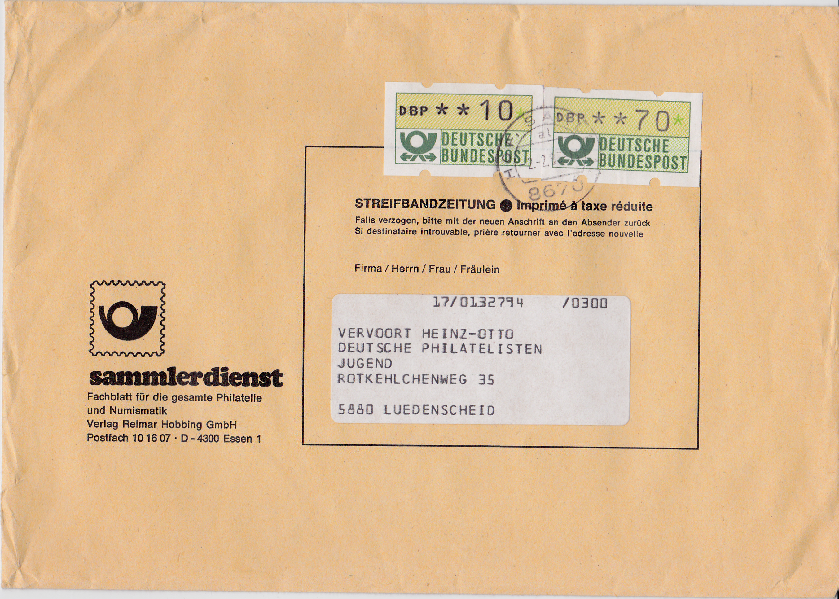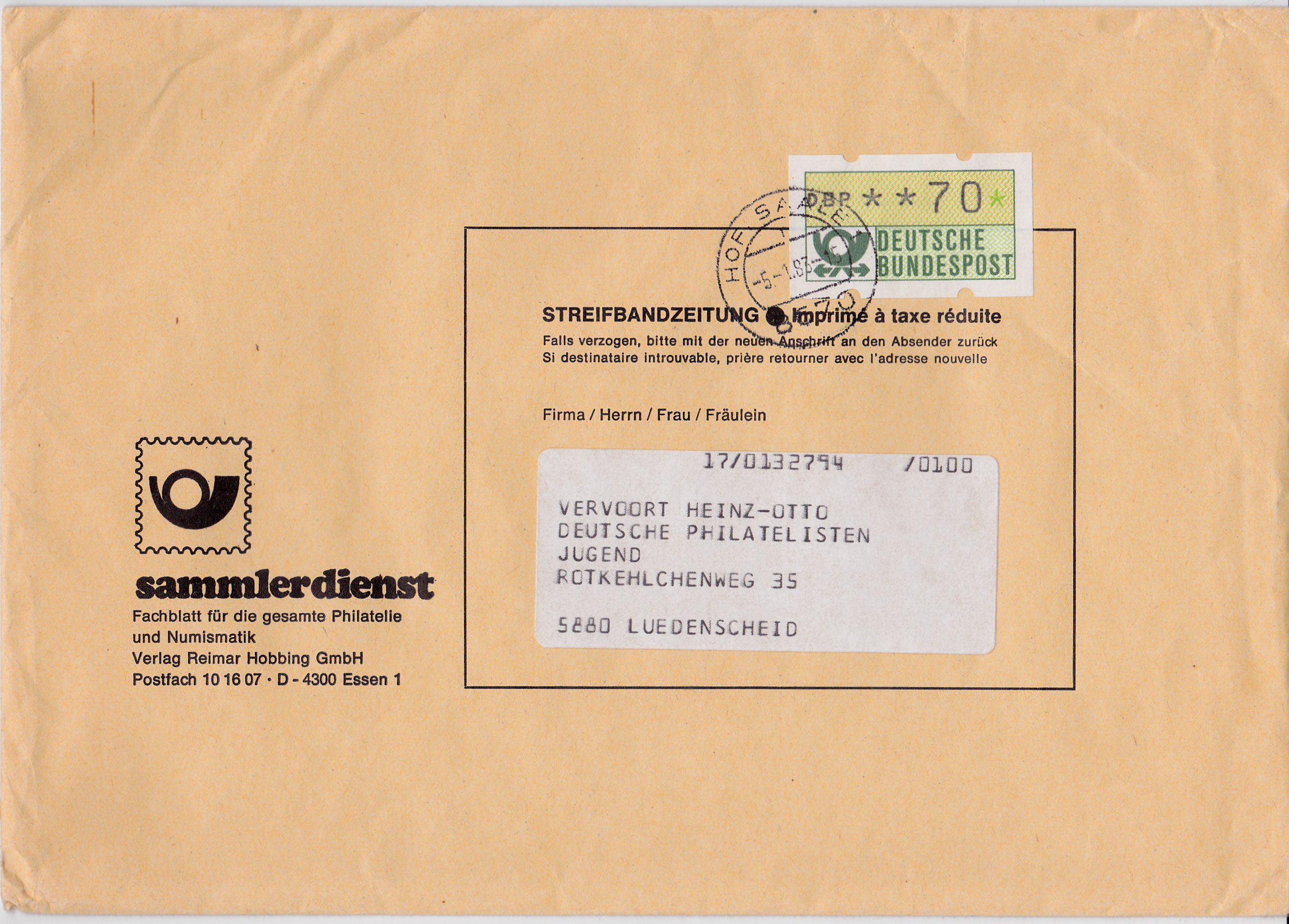 In diesem Streifband wurde am 5.1.1983 der Sammlerdient verschickt. Aus Versehen oder aus Unkenntnis der Gebührenanhebung zum 1.1.1983 wurde diese Sendung noch zum alten Tarif mit 70Pf freigemacht und offensichtlich ohne Beanstandung auch befördert. Als Frankatur diente eine Automatenmarke zu 70 Pfennig.