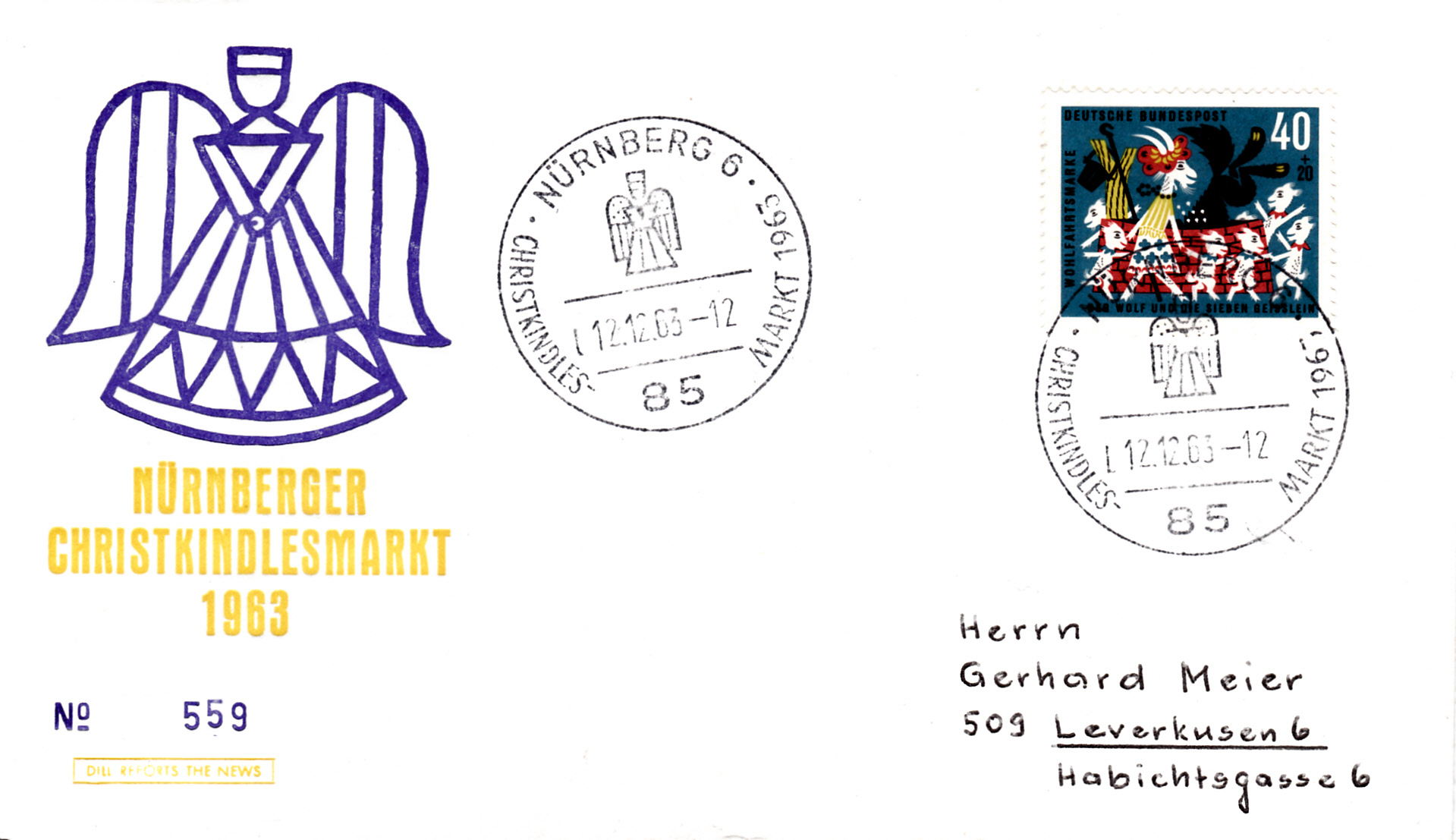 Dieser Brief von 21 bis 250g wurde am 12.12.1963 in Nürnberg mit der Wohlfahrtsmarke 1963 zu 40+20Pf (MiNr 411) portogerecht frankiert und mit dem Stempel zum Christkindlesmarkt gestempelt.