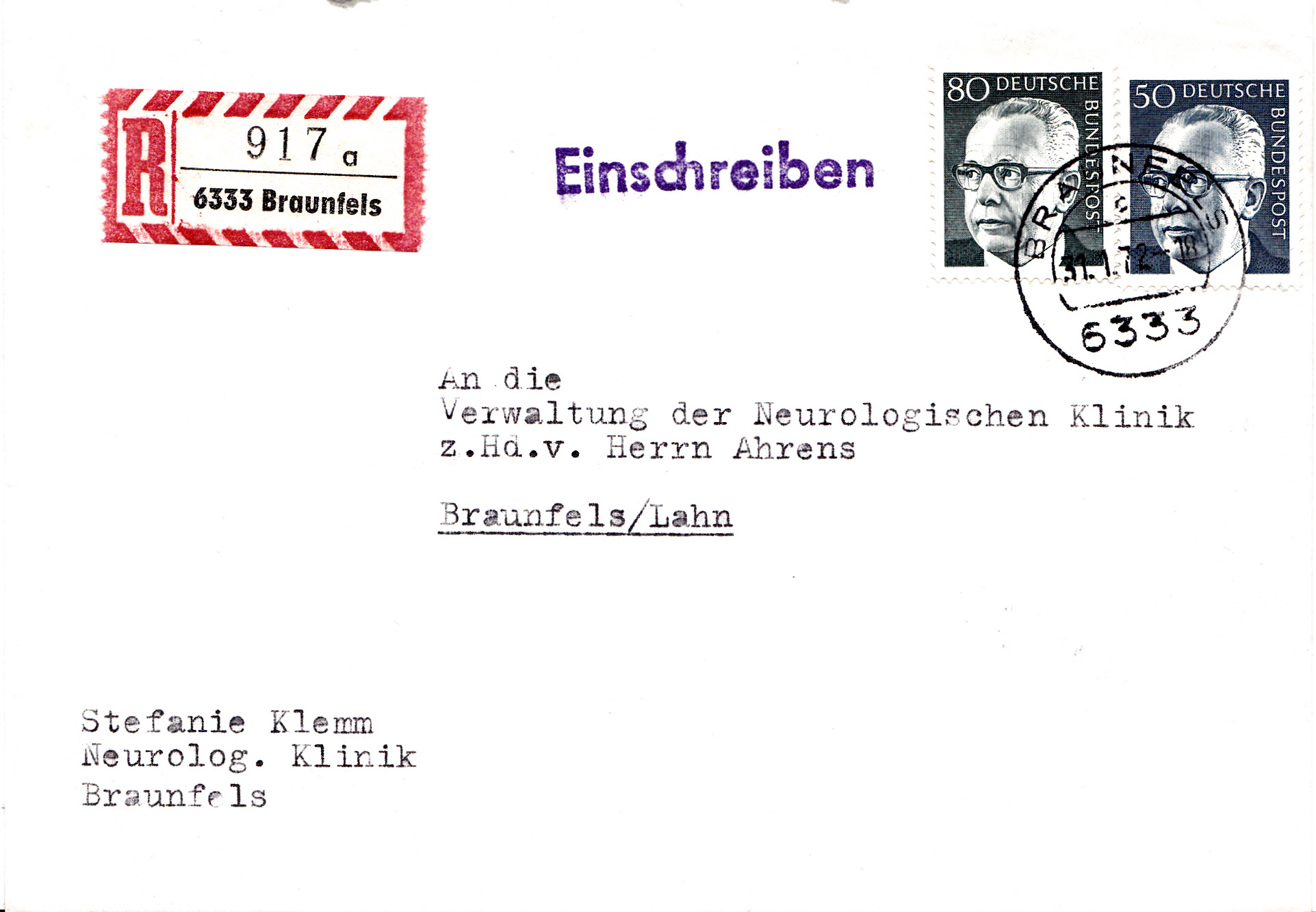 Es folgt ein Brief vom 31.1.1972. Er wurde mit Einschreiben innerhalb von Braunfels verschickt. Das Briefporto betrug bis 20g ebenfalls 30Pf. Die Zusatzleistung Einschreiben war am 1.9.1971 auf 100Pf gestiegen, so dass bei diesem Brief das Gesamtporto 130Pf betrug. Zur Frankatur wurden zwei Marken der DS Heinemann verwendet (MiNr 640 und 642)